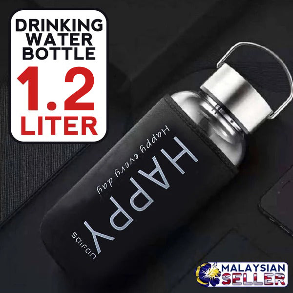 A glass water bottle. This Water Bottle is a 1.2 Liter Drinking Bottle. Portable and easy to be brought anywhere with it's lid handle that can be hold easily. A suitable drinking bottle for heavy drinkers with it's 1.2 Liter capacity to allow large consumption of water to keep hydrated. The lid is a seal tight twist lid.