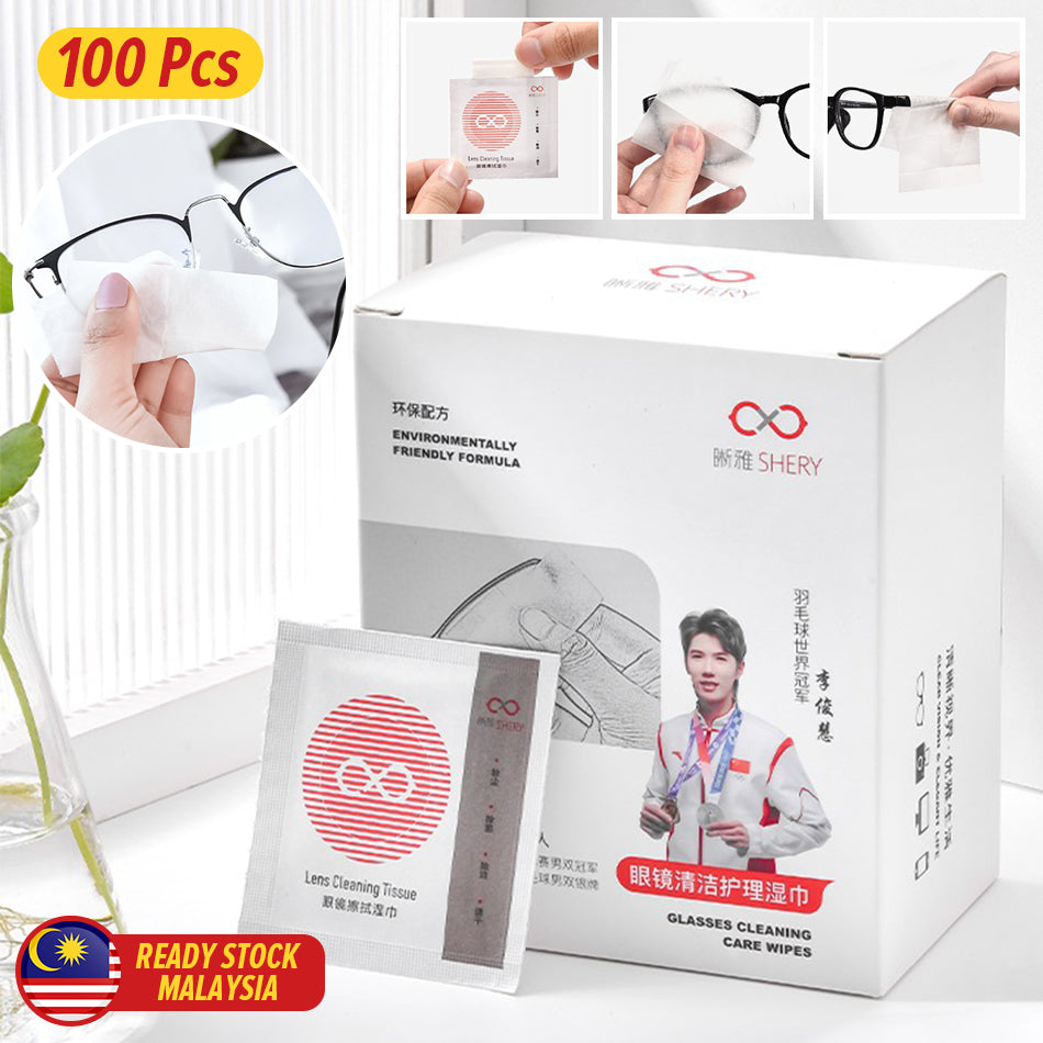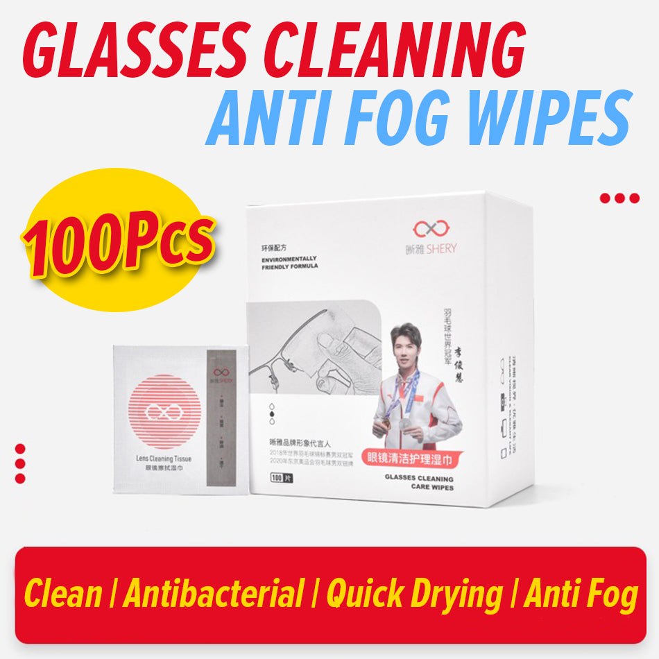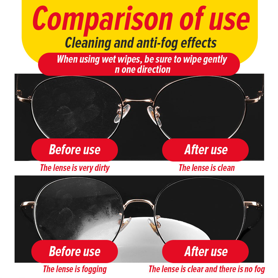 A set of 100pcs of cleaning wipes. With a gentle wipe, it dries quickly in 3 seconds without leaving marks. It cleans the lense of the glasses. Can also be used for mobile phones, computer and TV. It decontaminate and does not damage lense. Cleaning and anti fog effects.