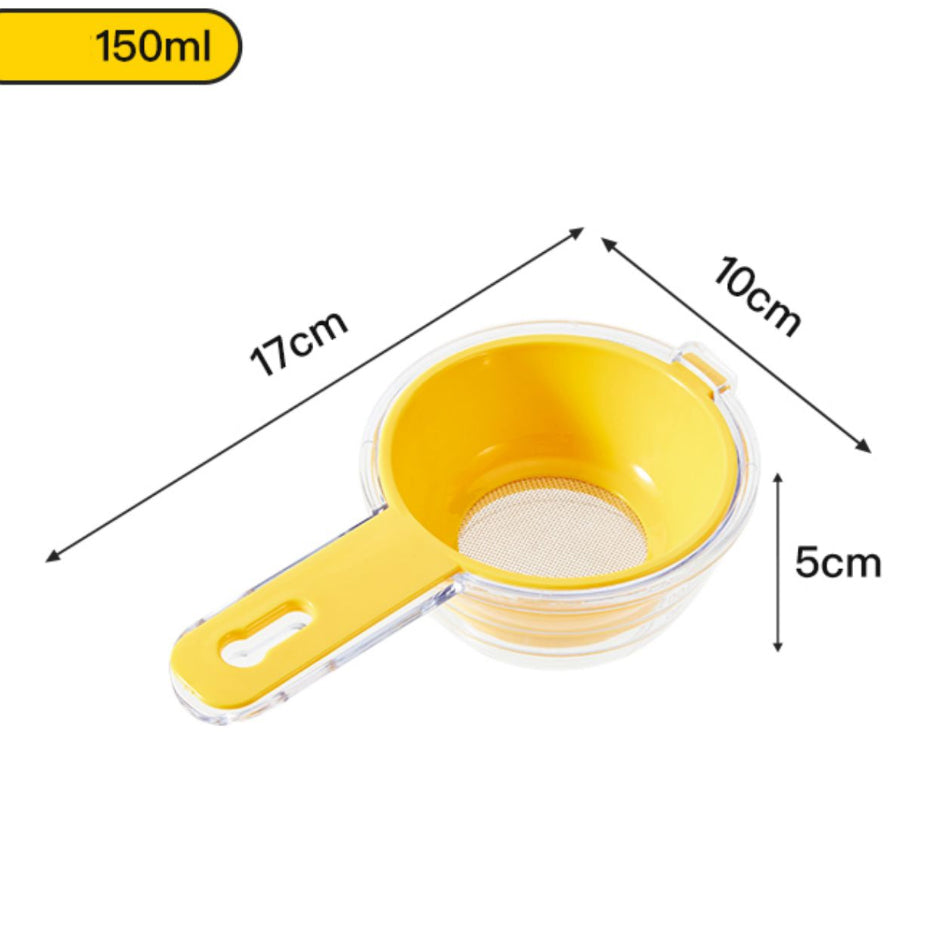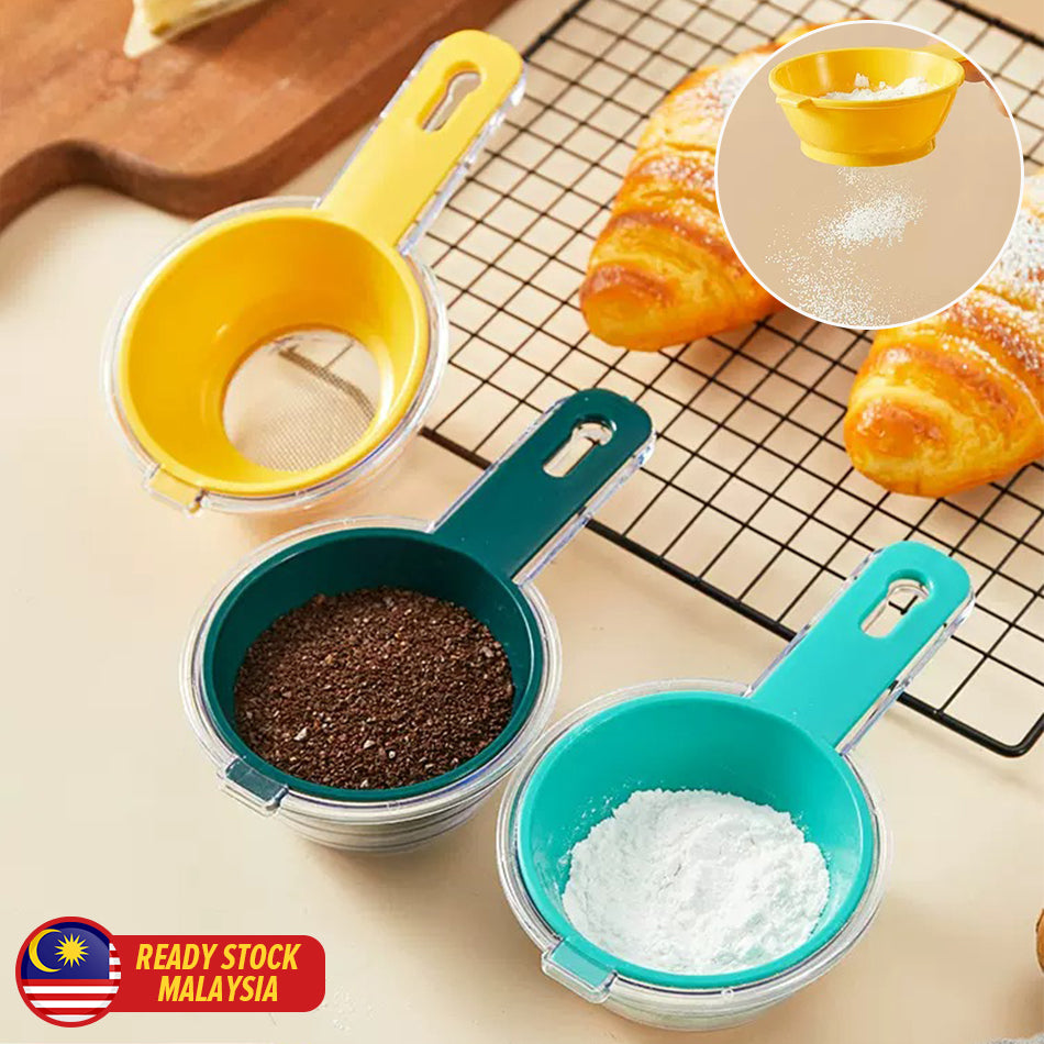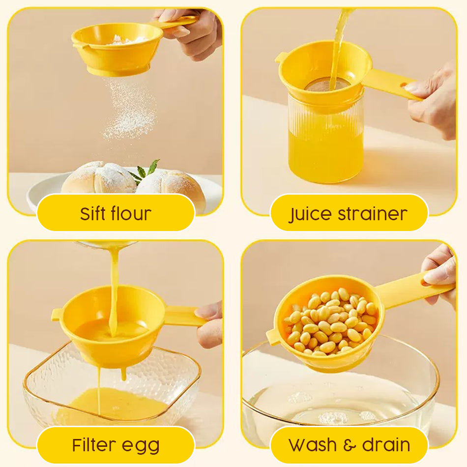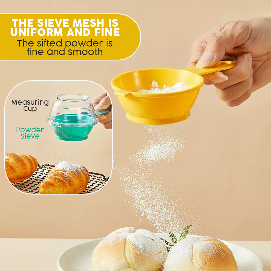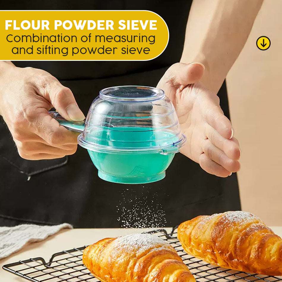 A flour and powder sieve and measuring scoop spoon. Can be used for sieving flour and powder and can also be used for filtering juice. Can also be used to filter egg yolks, and also wash drain.
