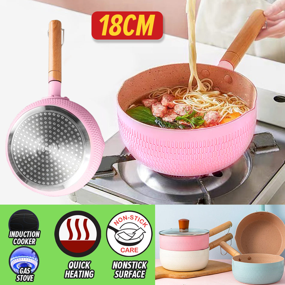 A 18cm nonstick coated Japanese snow pan pot. Suitable for cooking various types of food, from fried foods, stir fried food, stew, boiled food and many more. This cooking pot is compatible with gas and induction stoves. Such cooking stove includes, Gas Stove, and Induction Stove.