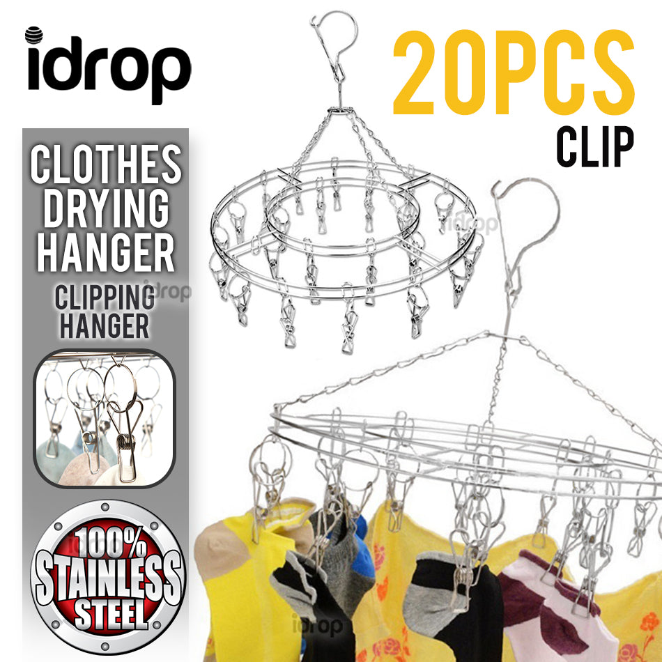 A stainless steel large round round undergarment drying hanger. Consisting of 20 clippers allow to hang clothes via clipping style. It is very spaces saving by having a simple compact clothing hanger.