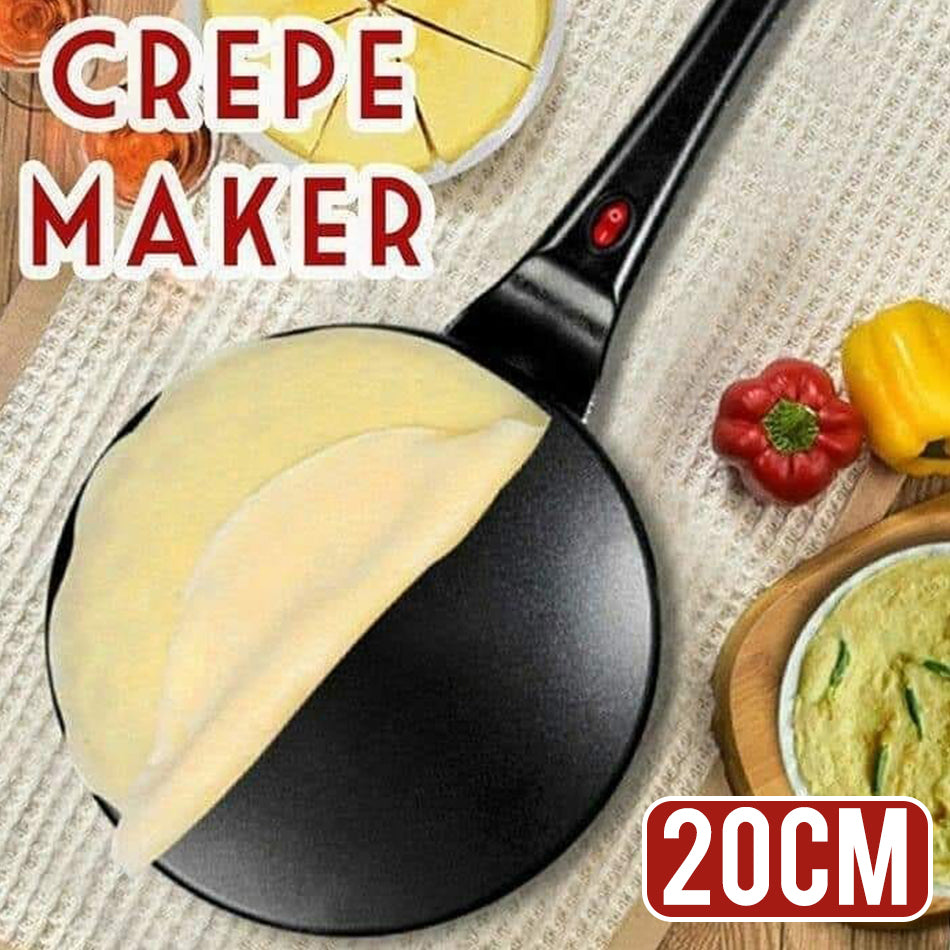 An electric powered Crepe Maker. It has a 20cm Diameter cooking surface which heats up when turned ON. It is able to cook/make crepe and also pancakes and eggs. It has a texture slight curved up surface which enables user to just hold the crepe maker and dip the surface onto a crepe/pancake/egg batter and it will soon cook the batter in no time becoming crepe/pancake and also cooked egg. It can be ON/OFF easily as the crepe make handle has the ON/OFF button on easy reach