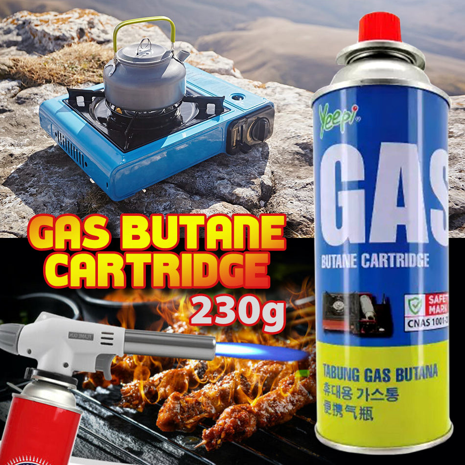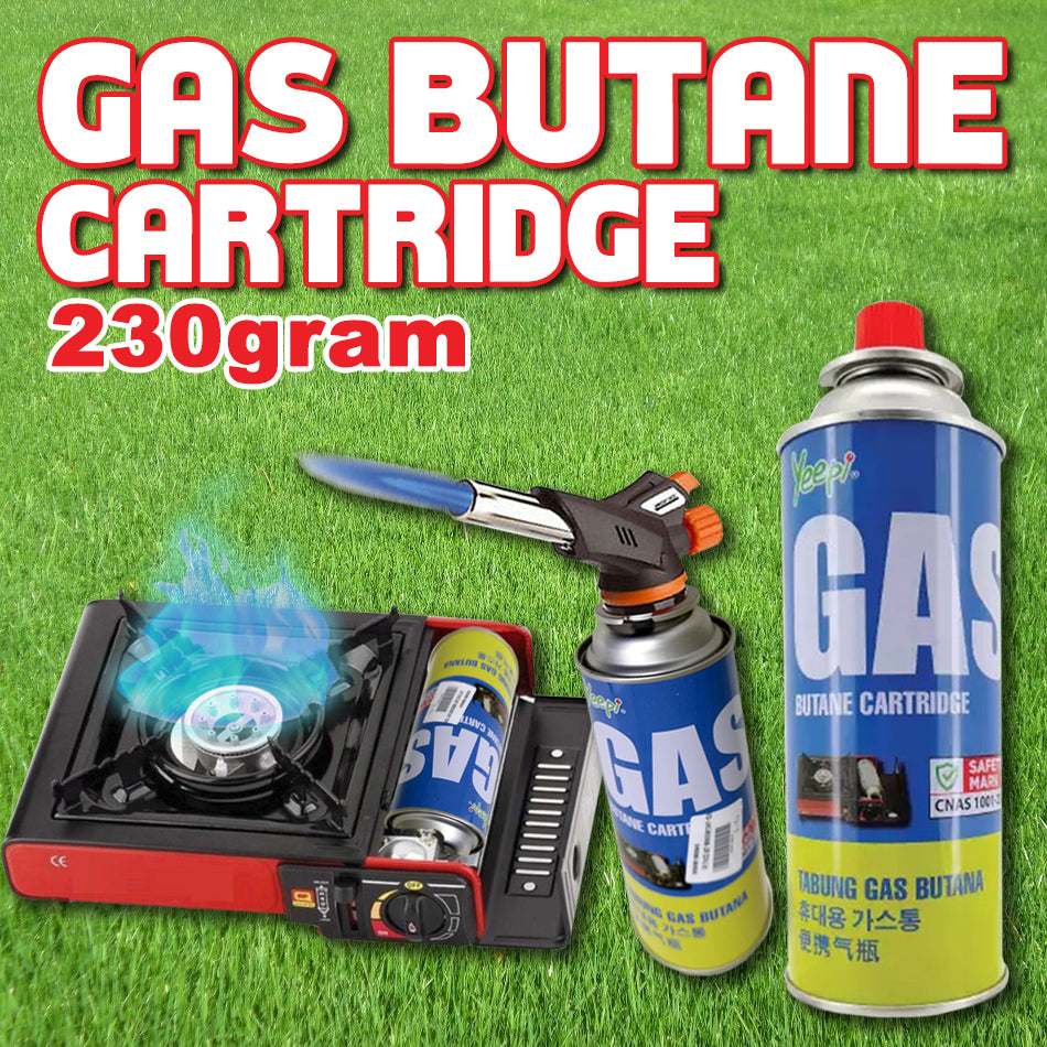 230 gram A portable butane gas cannister used to provide burnable gas for cooking purposes. Safe for usage with gas cooking stove and gas cooking butane gun.