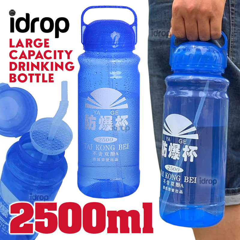 A 2500ml Plastic PP Drinking Water Bottle Container. Suitable for any daily outdoor or indoor usage. It's large quantity of volume capability is for the mere purpose of ensuring users get hydrated drinking a good large amount of water. It also has a filter cap, and straw to ensure to drink with ease.