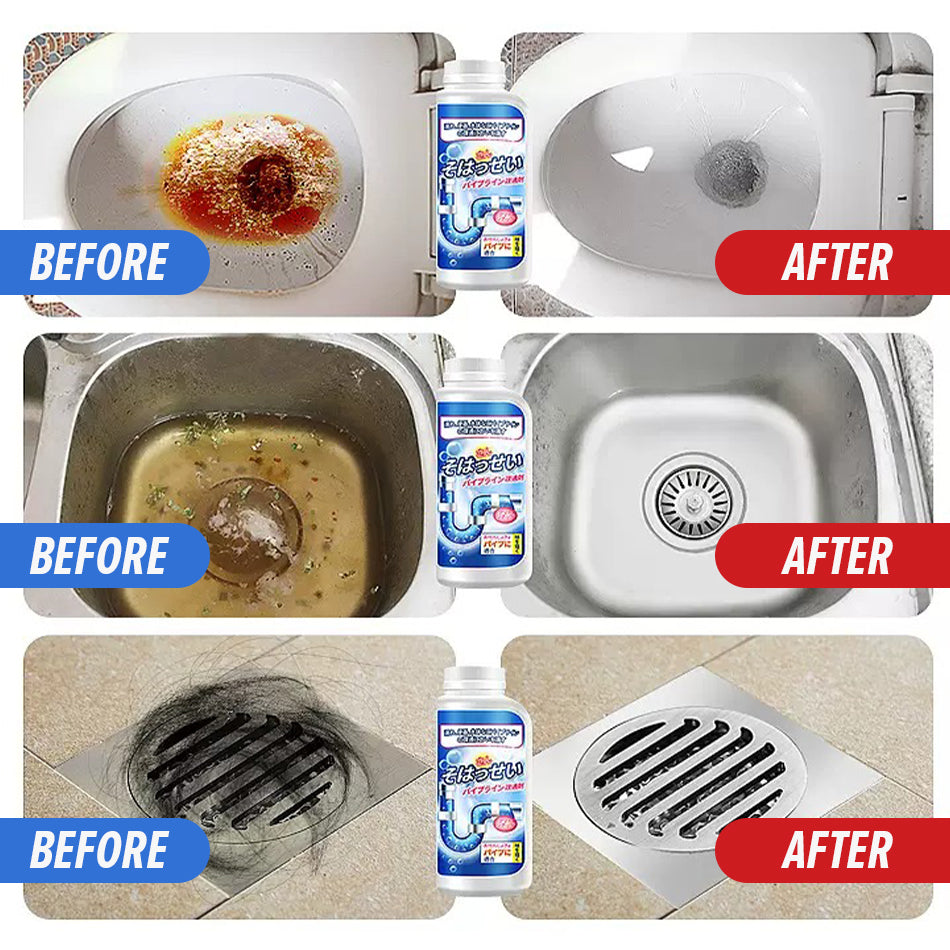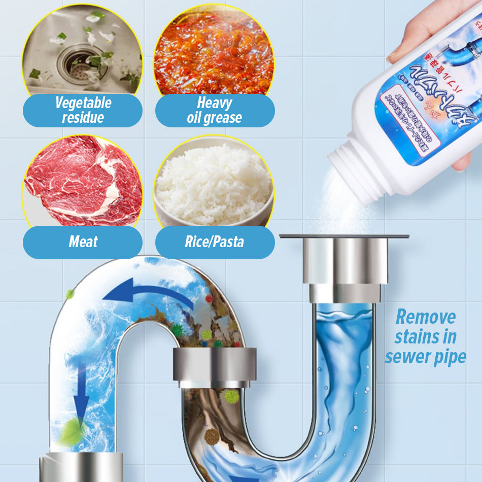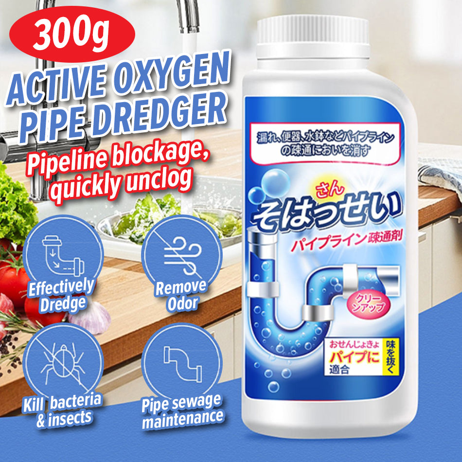 A powder based cleaning dredging agent that helps to unclog clogged drainage of pipes such as from sinks, toilets and shower drainage. The powder reacts with contact with water and helps unclog the drainage by dissolving the clogged matter. It helps smoothen out drainage to allow proper water drainage. It also help to clean and disinfect the pipe system and prevents bad odor