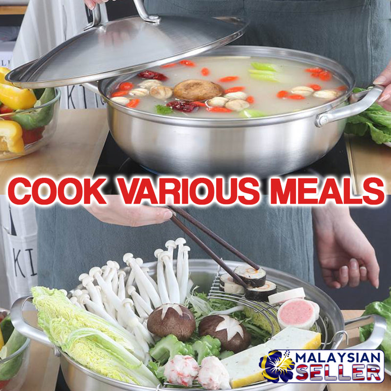 A Stainless Steel Cooking Pot with a cooking area of 32cm. The Cooking Pot is included with the cooking lid cover and has handles on the cooking pot and lid itself for easy handling.