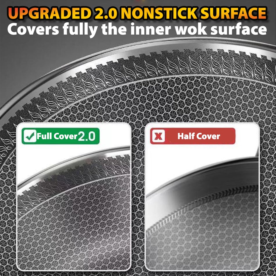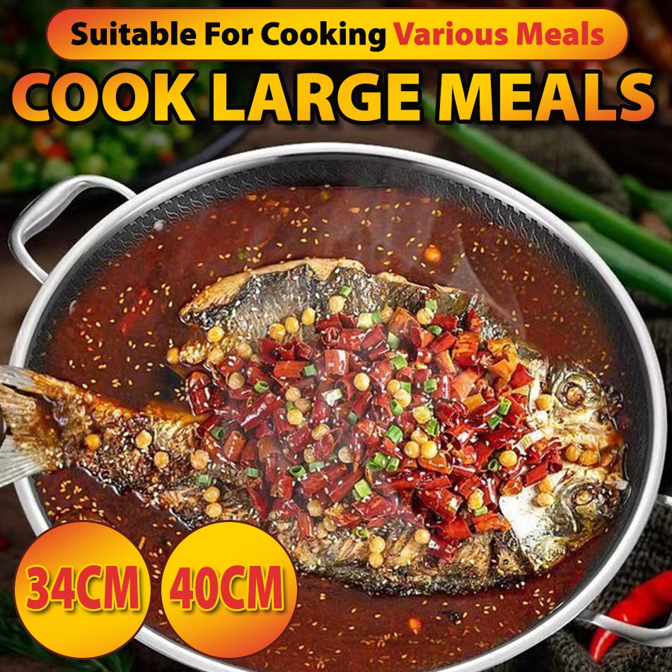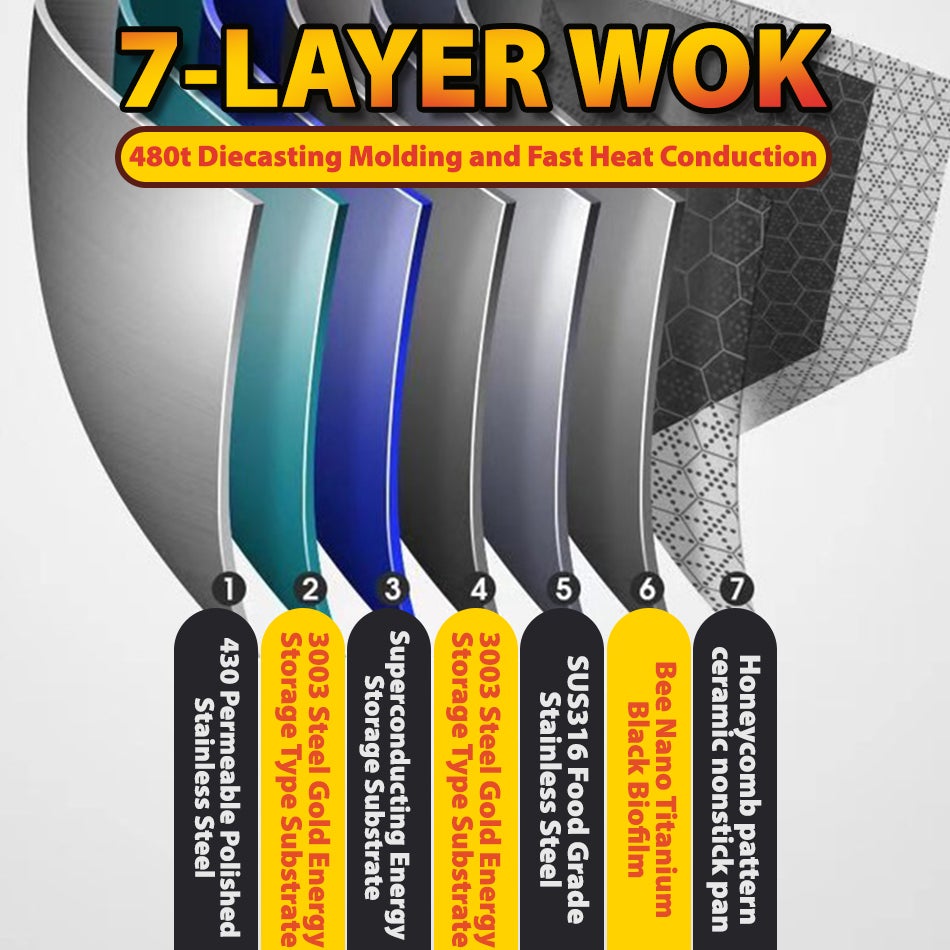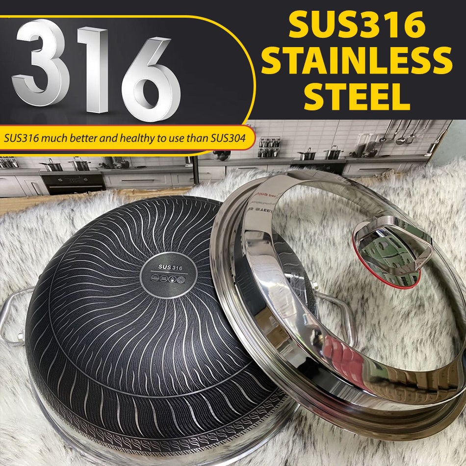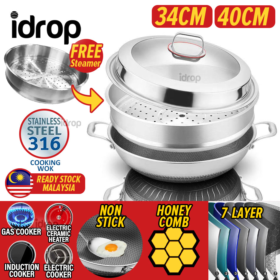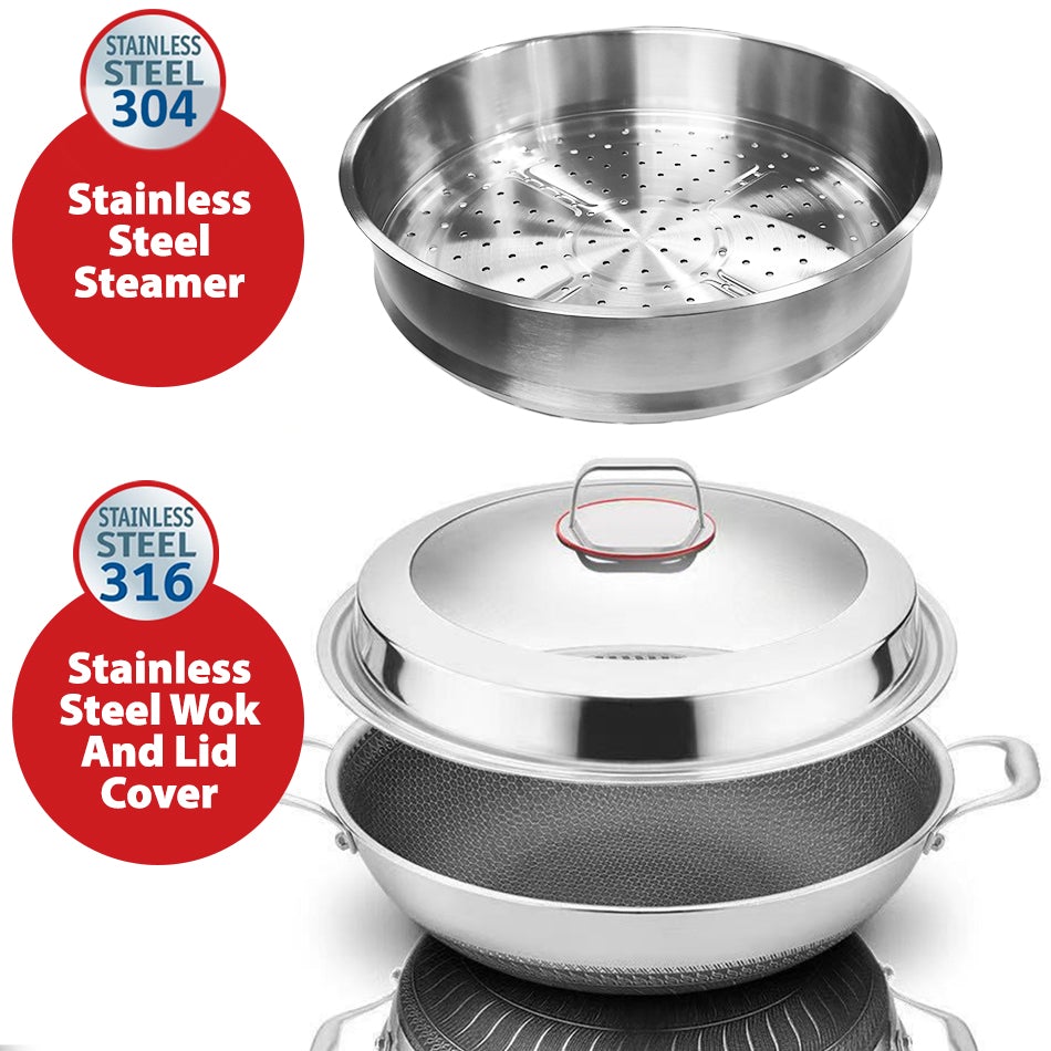 A 34CM and/or 40CM Cooking & Steaming honeycomb nonstick cooking wok made from food grade SUS316 Stainless Steel and steamer made from food grade SUS304 Stainless Steel. It is a cooking wok that also includes a steamer layer for FREE. It has a fast heating conductive wok bottom and is cast molded consisting of 7 layers. It is suitable and compatible with various cooking stove which is Gas Stove, Induction Cooker, Electric Ceramic Stove and Electric Cooker.