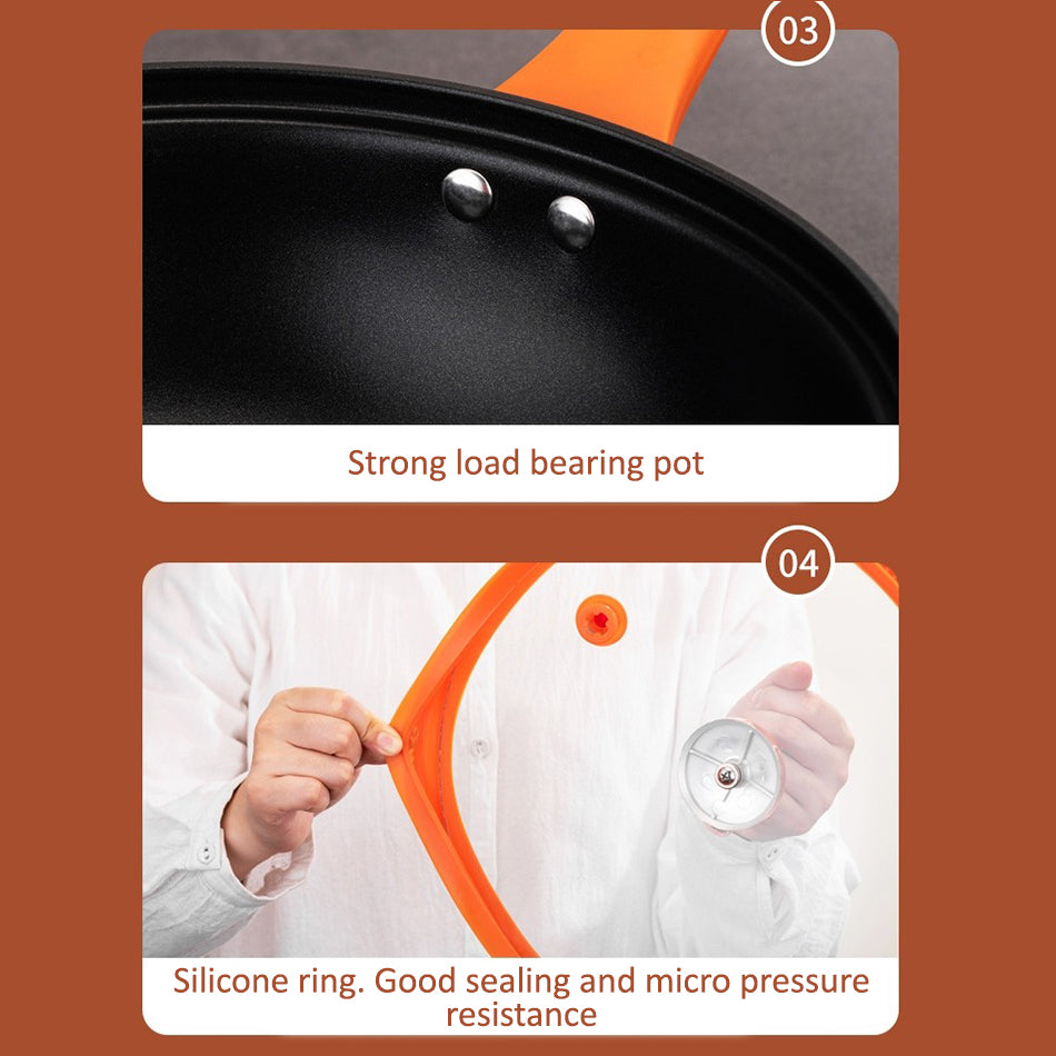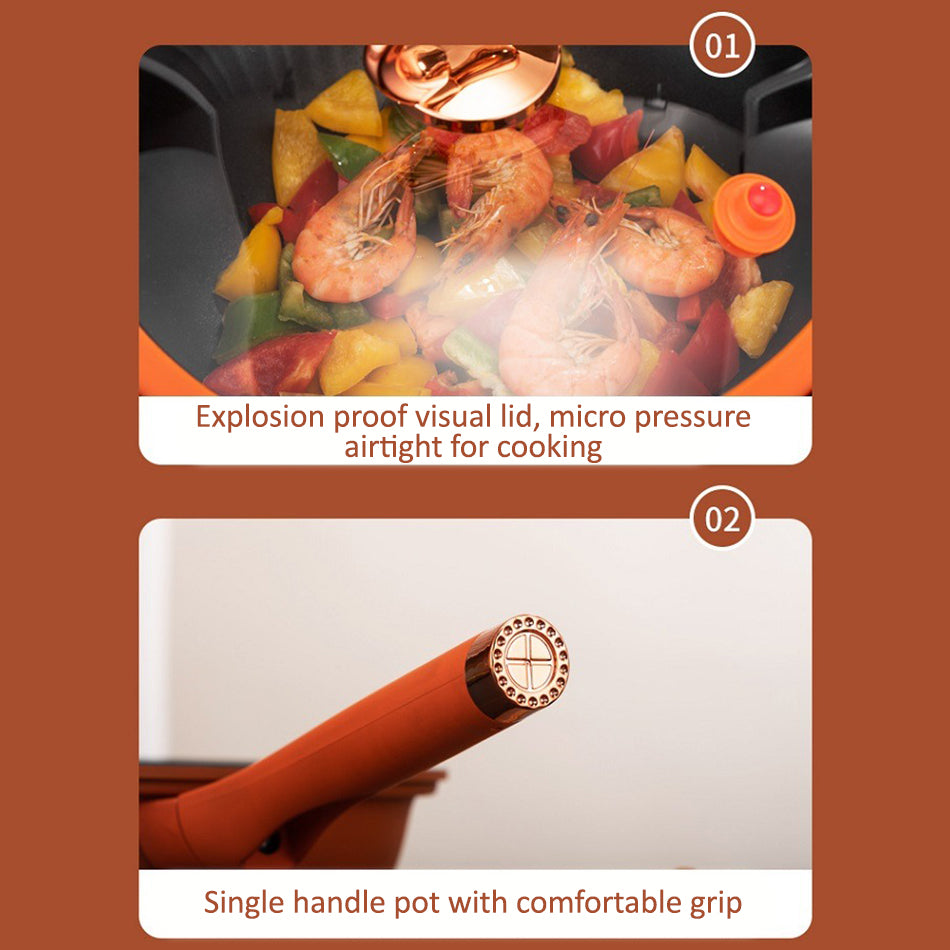 A micro pressure single handle cooker pot. Helps enhance flavor. Micro pressure seal. Continuous cycle of heating and cooking. Fast thermal conductivity and suitable for various cooking stoves.