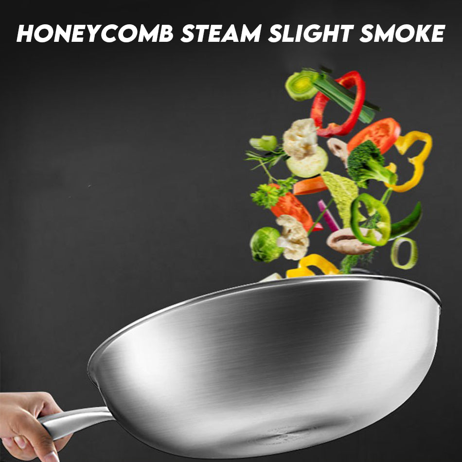 -Avoid burning fire, stainless steel honeycomb wok pan has heat conduction, no need to open a huge fire, on the one hand, fuel-saving, on the other hand, can effectively reduce the stick pan, pasta pot, but also avoid the yellowing or stain of the wok pan.