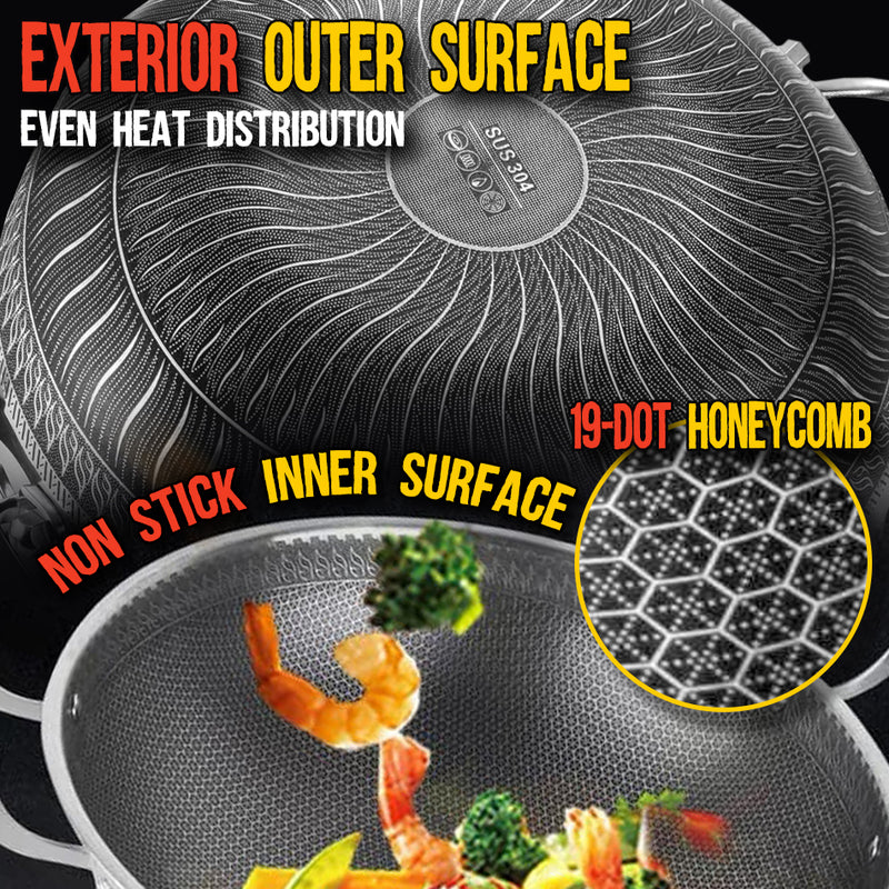 -Avoid burning fire, stainless steel honeycomb wok pan have heat conduction, no need to open a huge fire, on the one hand, fuel-saving, on the other hand, can effectively reduce the stick pan, pasta pot, but also avoid the yellowing or stain of the wok pan