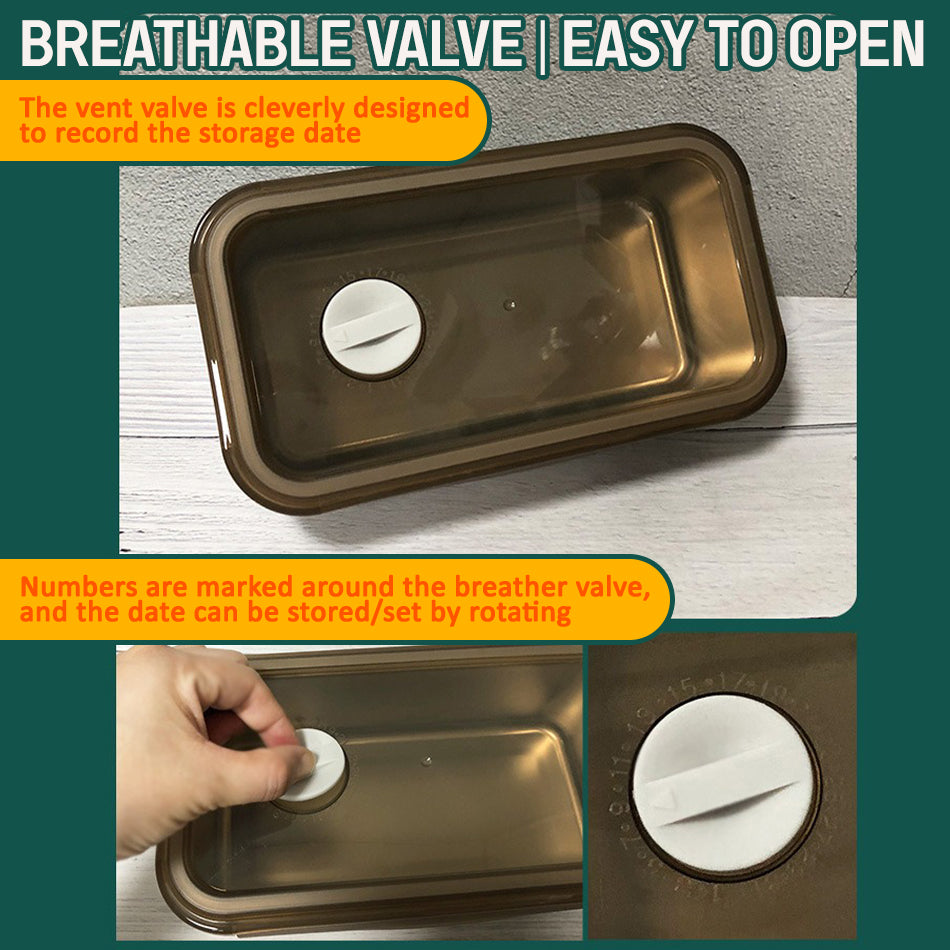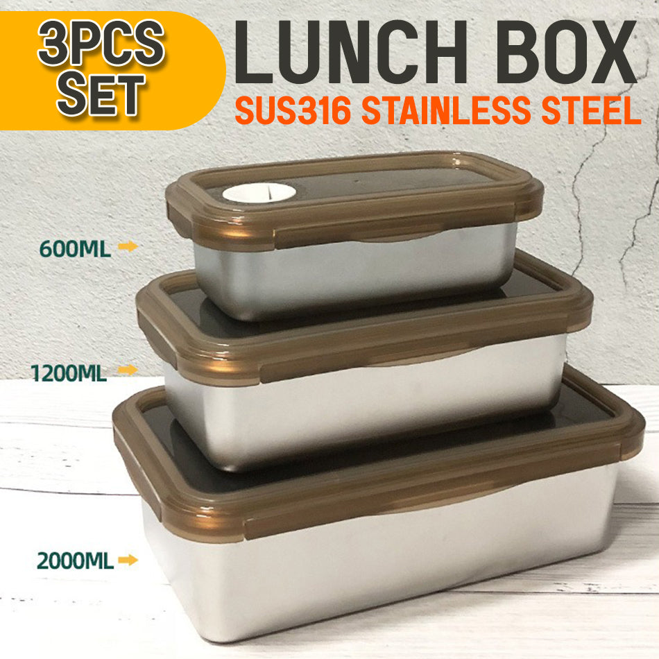 A leakproof seal tight freshkeeping food storage box container. Comes in 3 pieces set of small (600ml), medium(1200ml) and large(2000ml) size food container. The leakproof lid cover also has a valve to help release seal vacuum tight pressure. The valve also has numbers to mark date when it was stored. Keep stored food fresh without deterioration. Can be refrigerated in refrigerator and heated . The container is made from SUS316 stainless steel and the lid is PP material