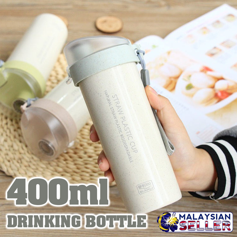 Is a drinking bottle with a volume capacity of 400ml. Made from Wheat Straw Plastic as it's unique feature. It is itself portable and comes with a strap. The Lid cover is unique in a way, it has a flip open cover protector. Open the cover to drink.