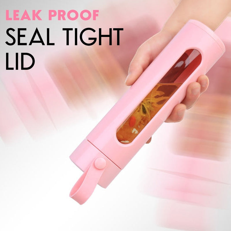 A 520ml drinking bottle glass flask, with a plastic exterior and a glass container within. It comes in many random various colors. A suitable size for portability and mobility. It also consist of a stainless steel filter within.