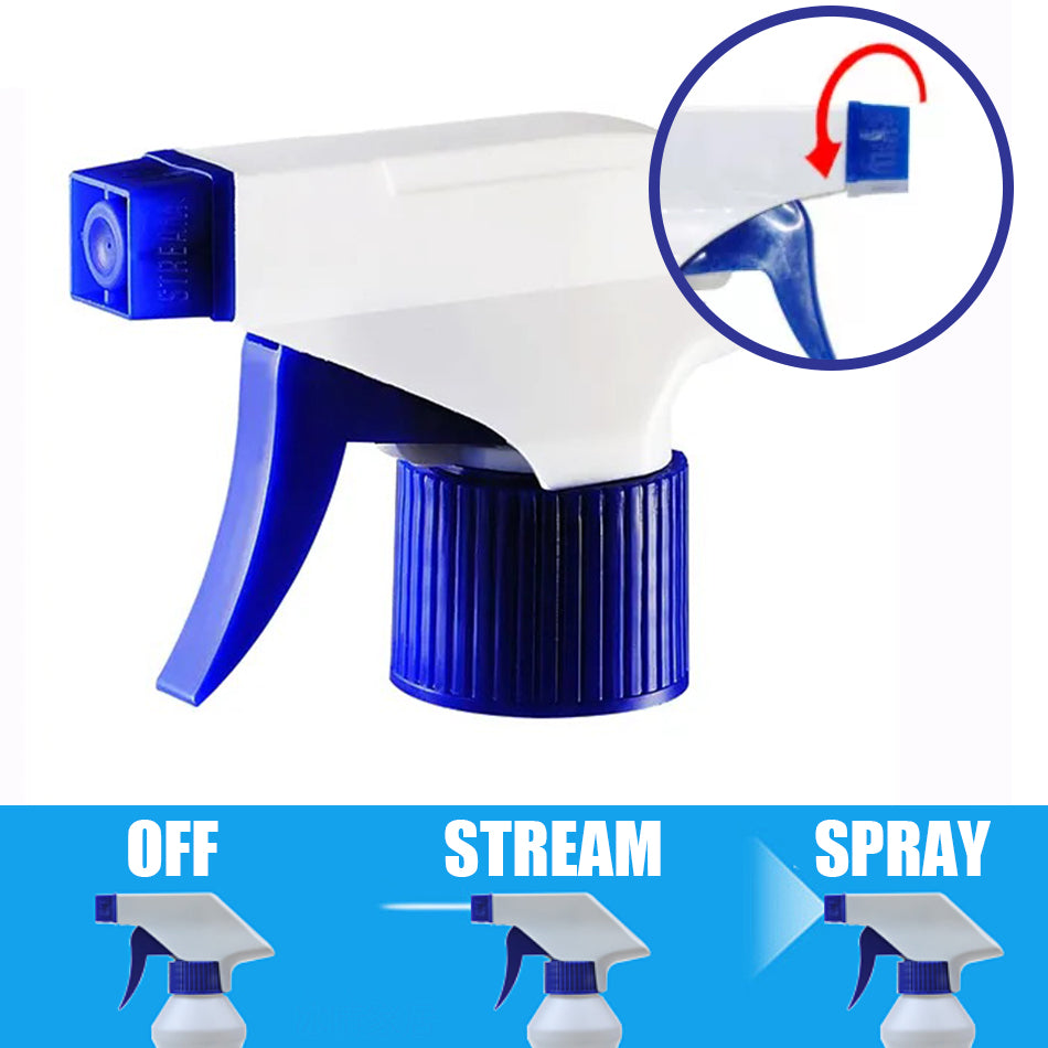 A bottle spray trigger head with adjustable spray with a simple twist of the nozzle. Can spray in stream or spray burst.