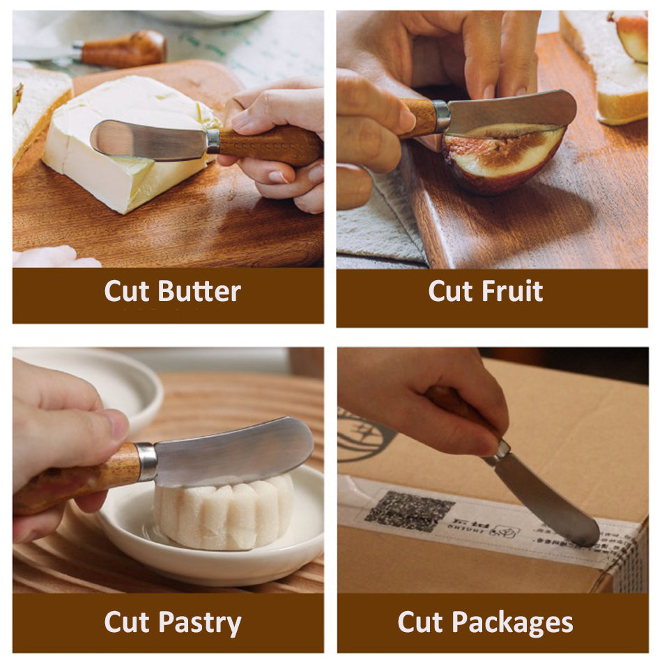A butter knife with wooden handle. Suitable for cutting butter, spreading jam and butter on bread or toast. Can be used for cutting fruits and even pastry or bakery goods. Can also be used for opening packages and letters.