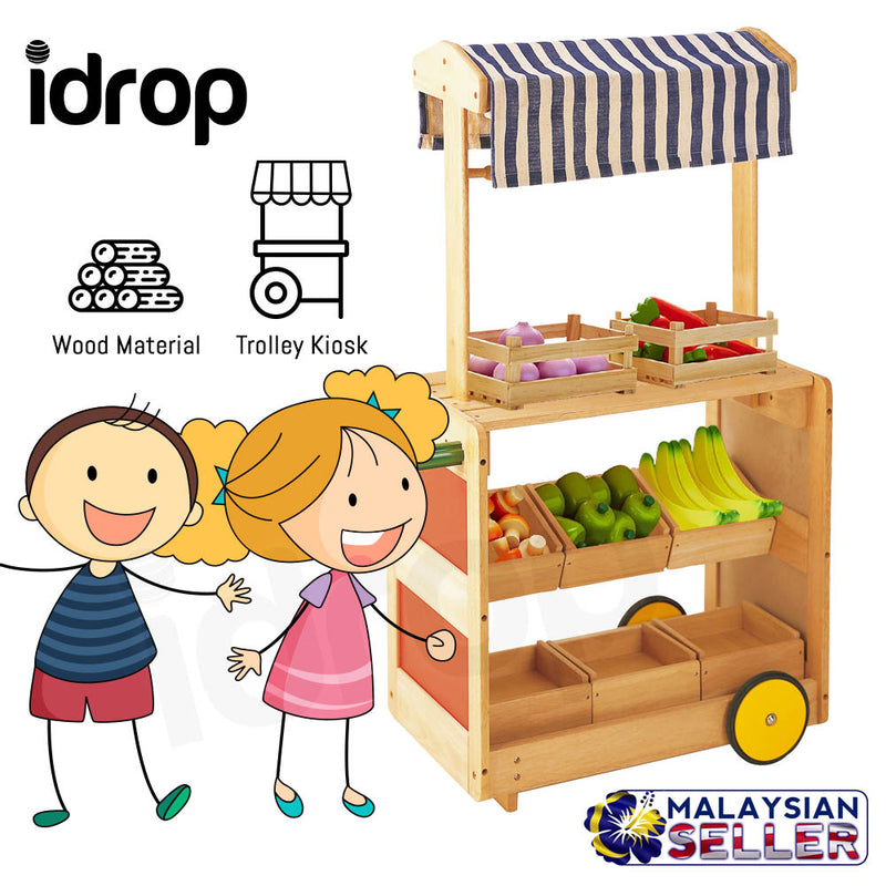 A wooden floor standing kiosk that comes with a cloth canopy and 6 storage trays. It has 2 handles to push the cart on the wooden wheels.