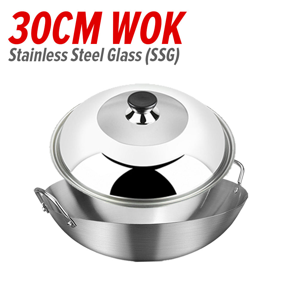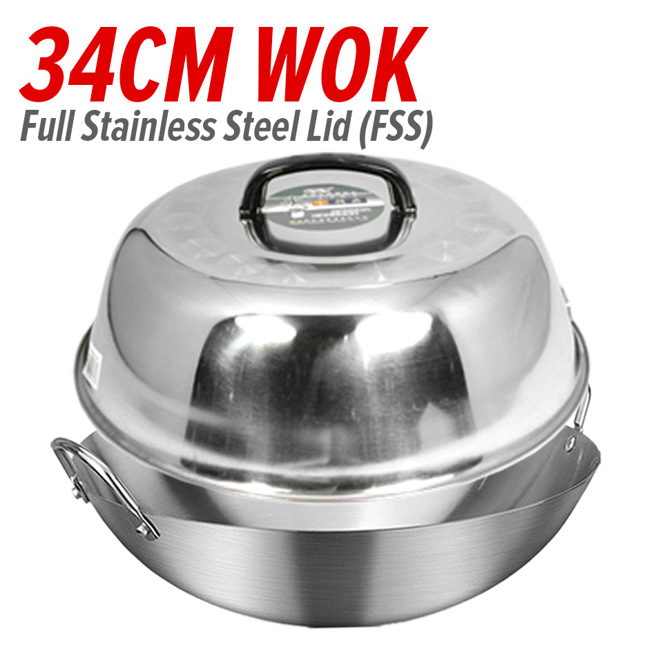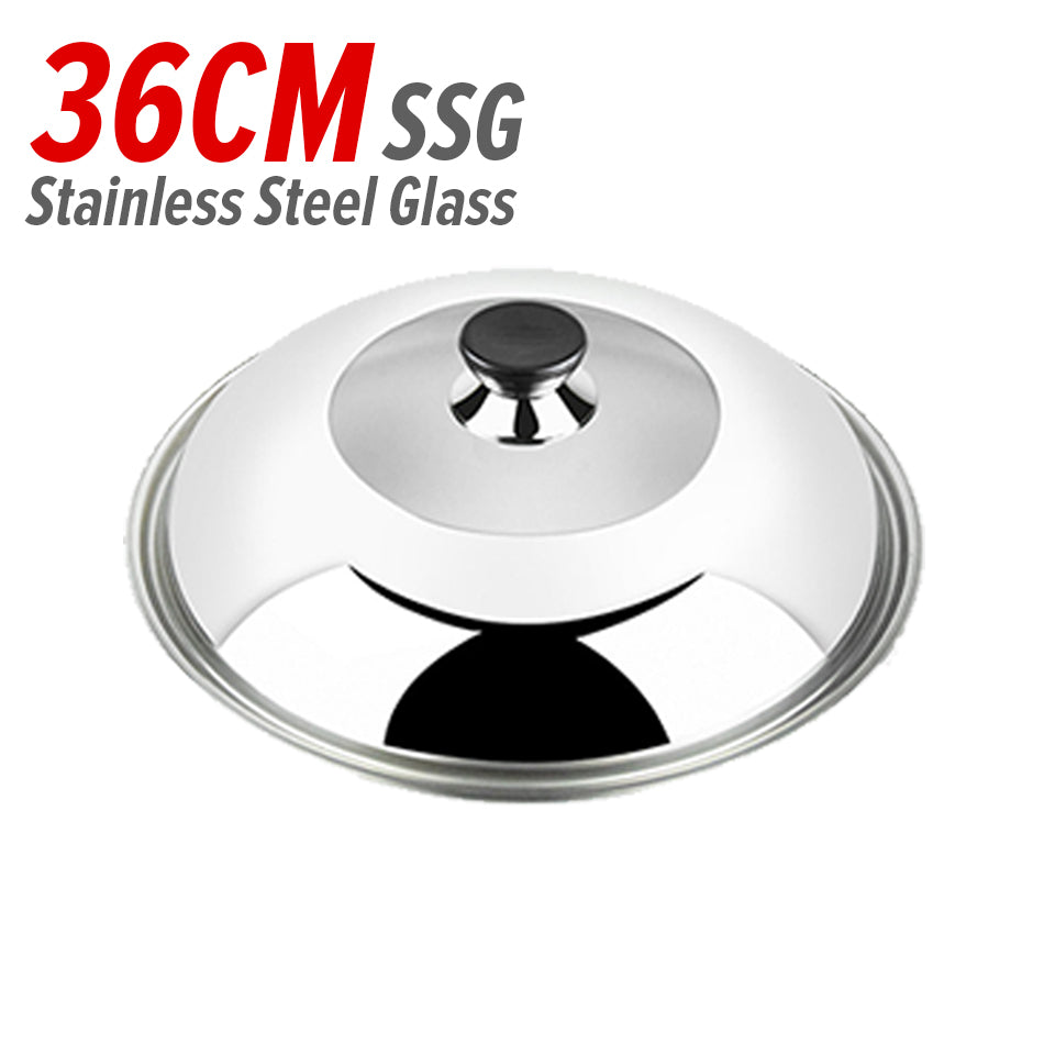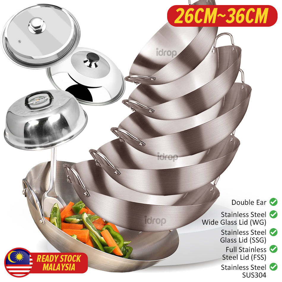 A double ear stainless steel cooking wok. Made from SUS304 stainless steel material. Uncoated material cooking wok. Comes in 26CM~36CM. Comes with selectable with lid covers or without lid covers. Also possible to buy lid cover only.