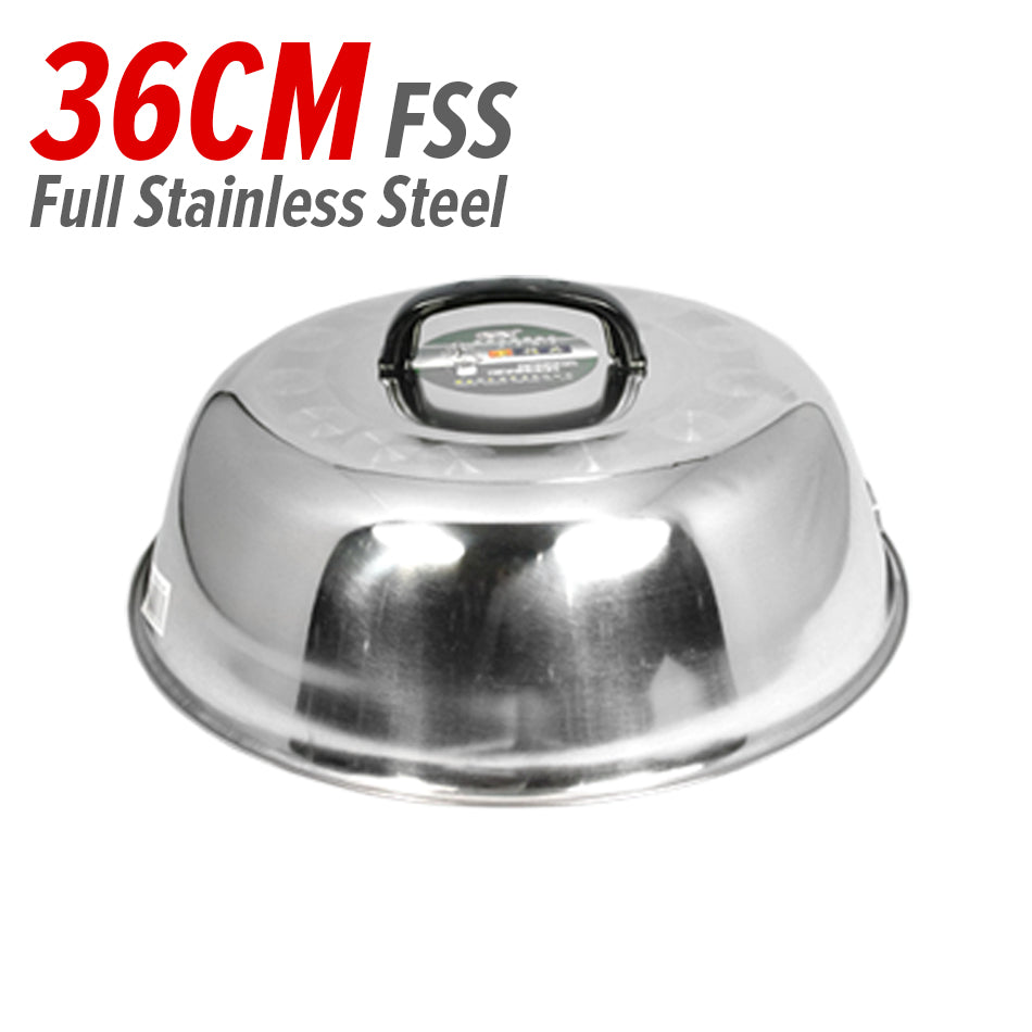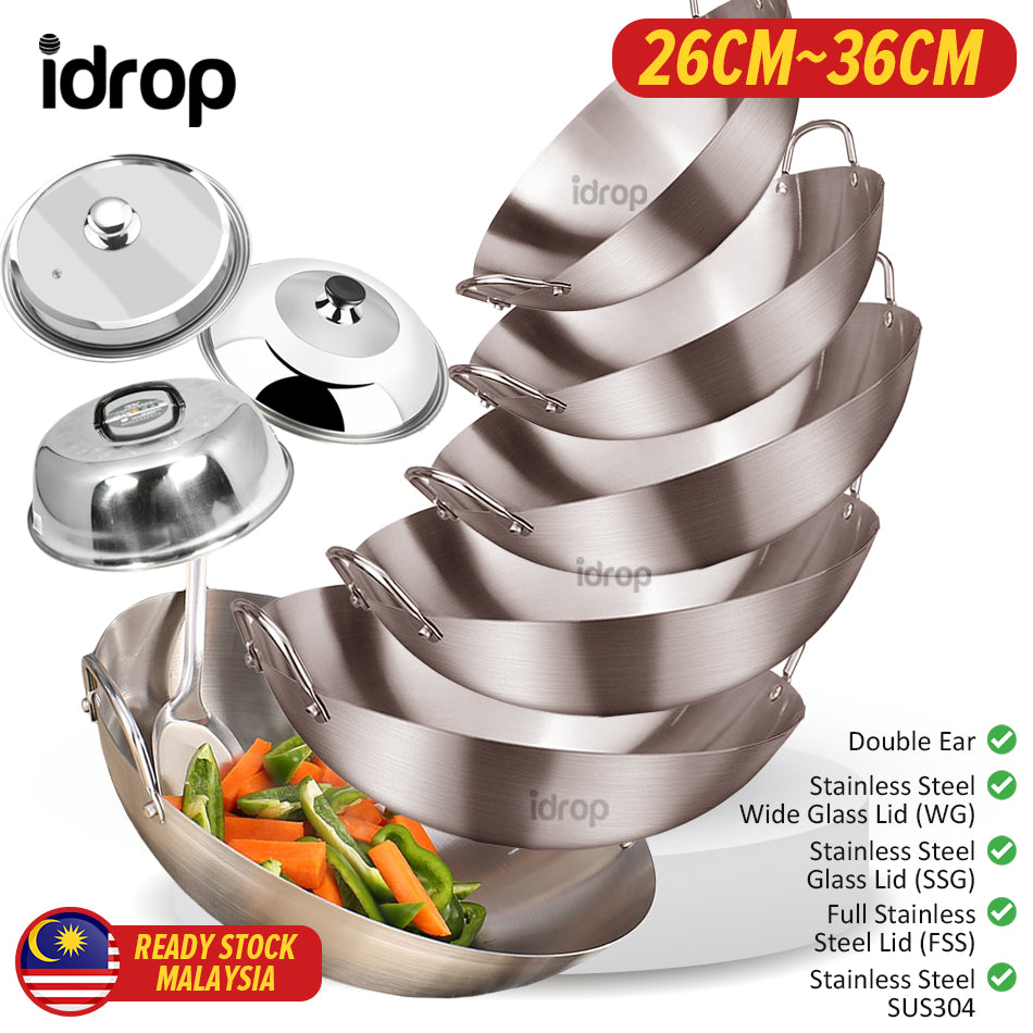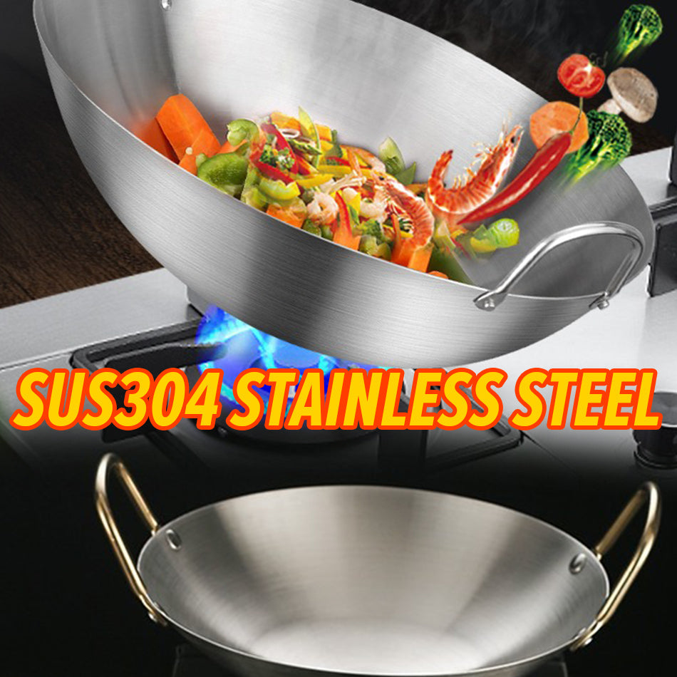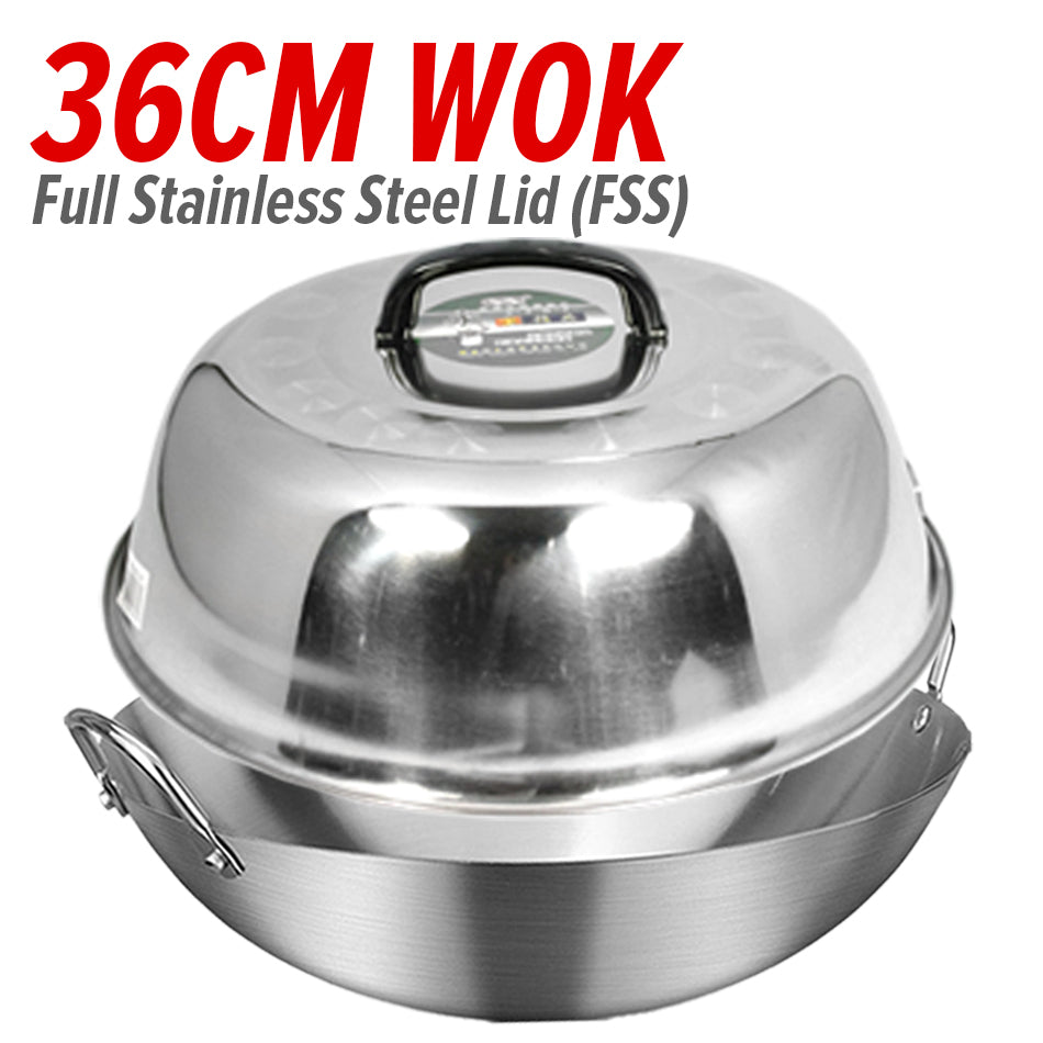 A double ear stainless steel cooking wok. Made from SUS304 stainless steel material. Uncoated material cooking wok. Comes in 26CM~36CM. Comes with selectable with lid covers or without lid covers. Also possible to buy lid cover only.