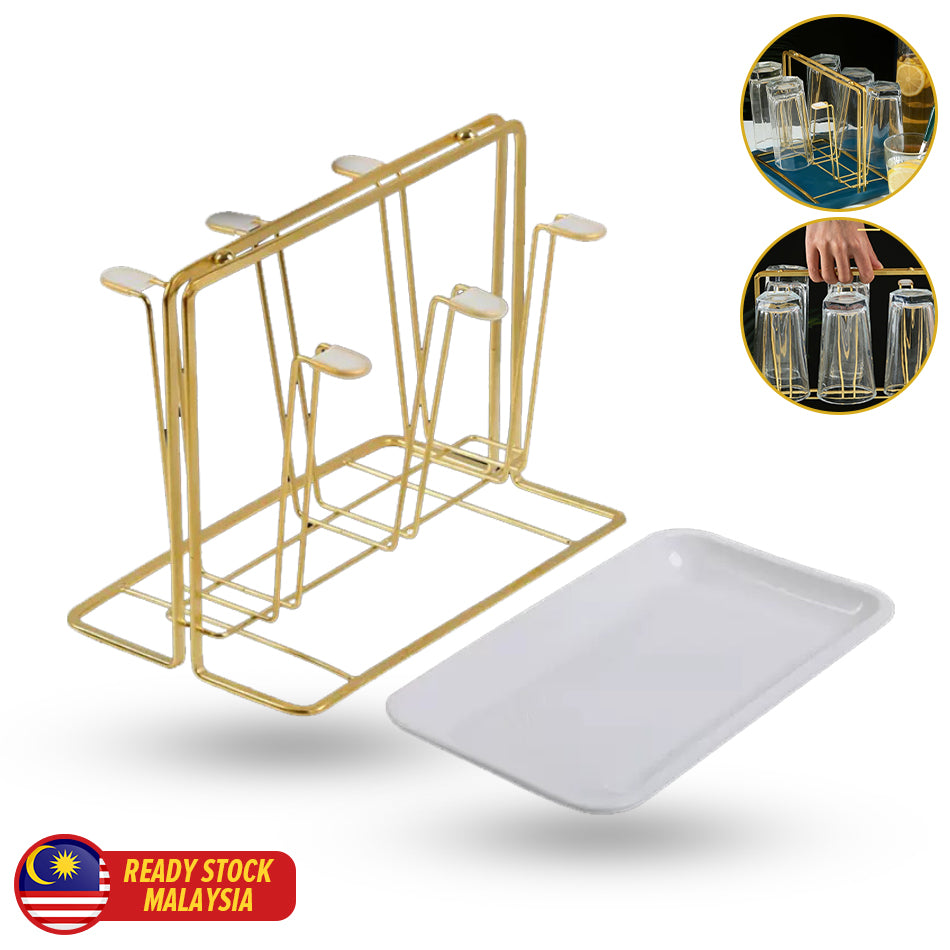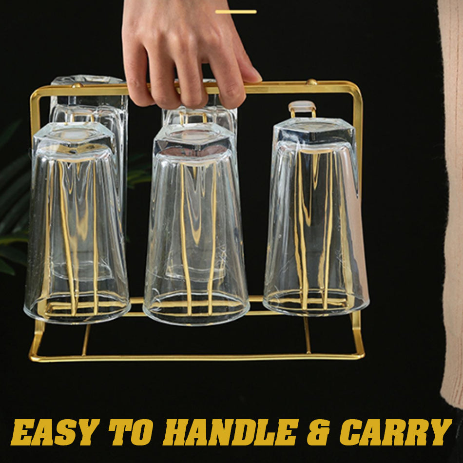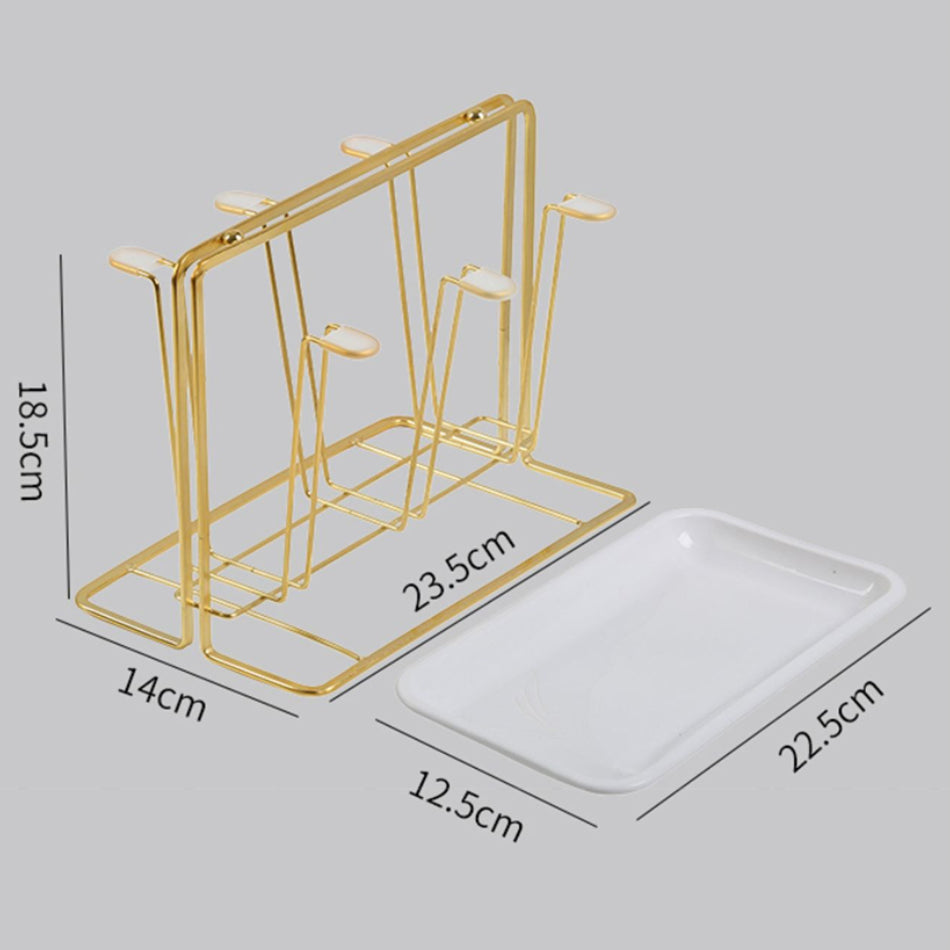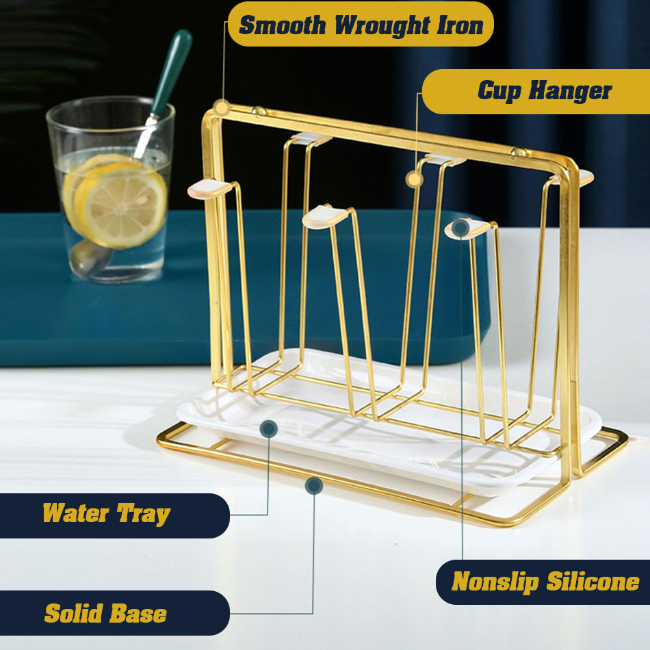 A steel cup storage rack. Capacity of storing holding 6 cups. The cup rack includes also a drainage tray.