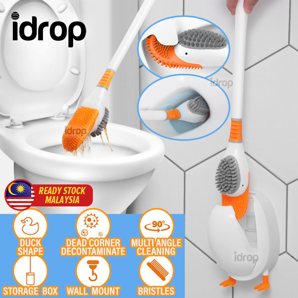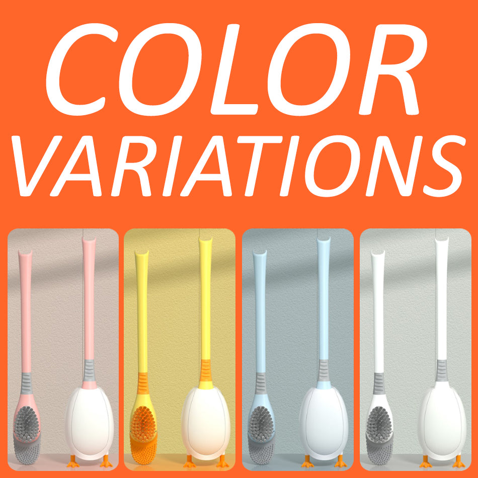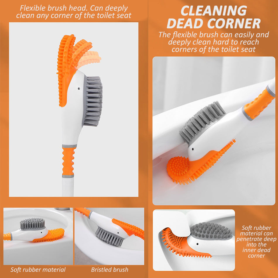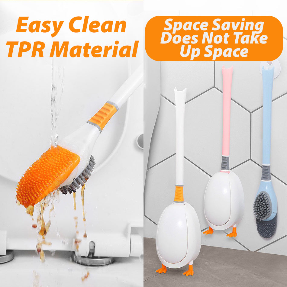 A diving duck shape design toilet seat cleaner. It has a flexible rubber tip and bristle brush to clean toilet seat and also hard to reach regions of the toilet crevices. It can also be wall mounted by placing the brush for storage.