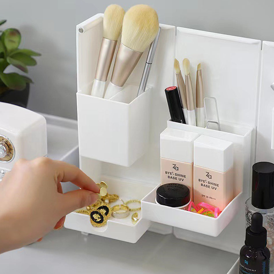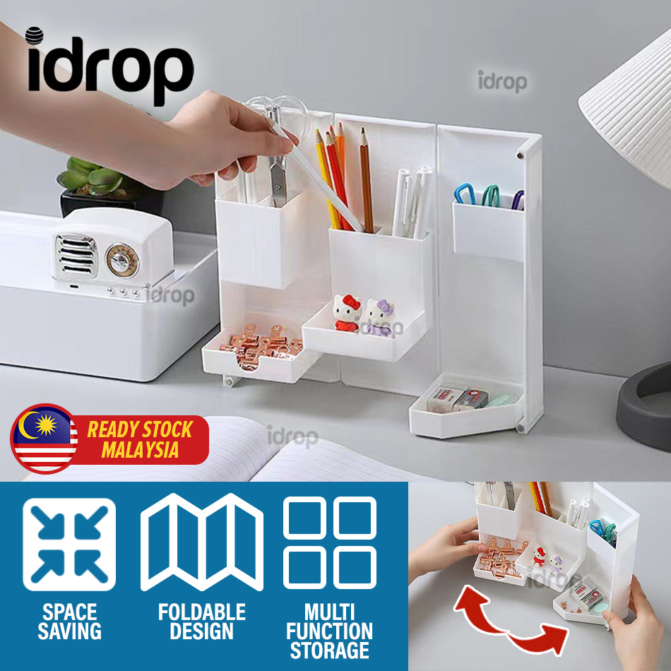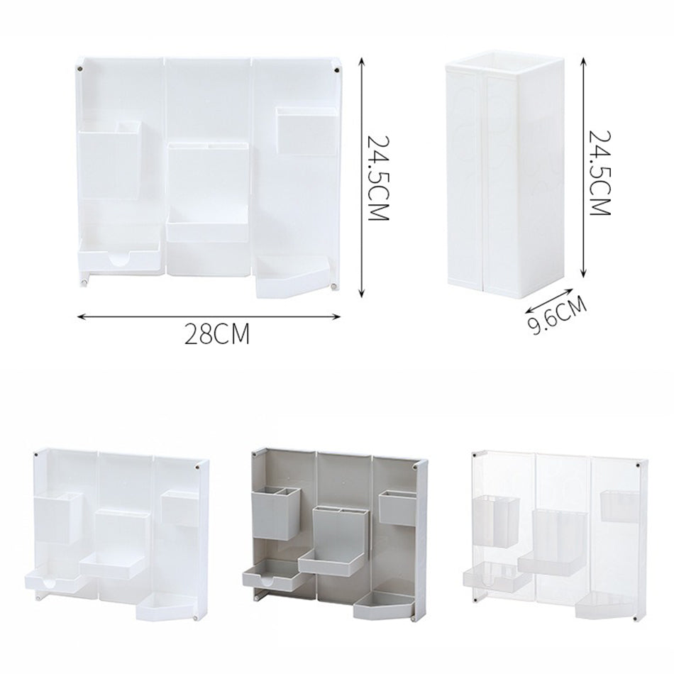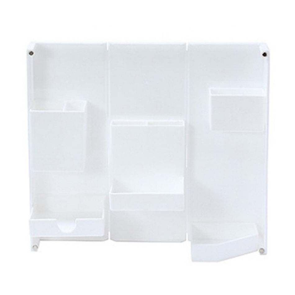 A foldable multifunction storage box. It can be folded open and closed. Suitable for storage of stationary, makeups and also jewelry. Space saving design. Comes in random white or grey color and even translucent shade.