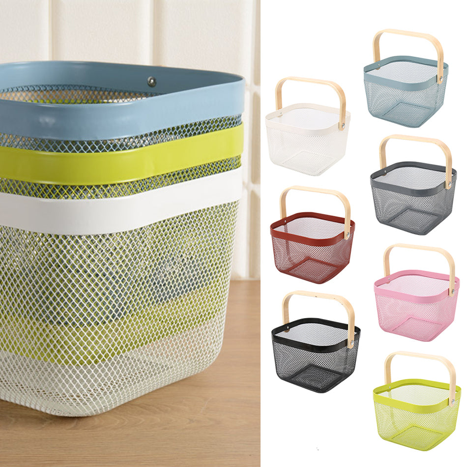 A mesh design iron basket with a built handle. An iron basket suited to be a fruit basket and vegetable basket. It also is suitable for storage of other items. Easy to keep and store items and comes in many color variation.