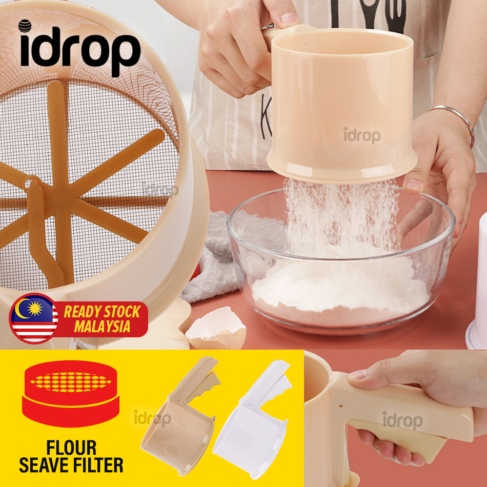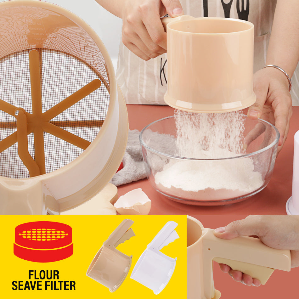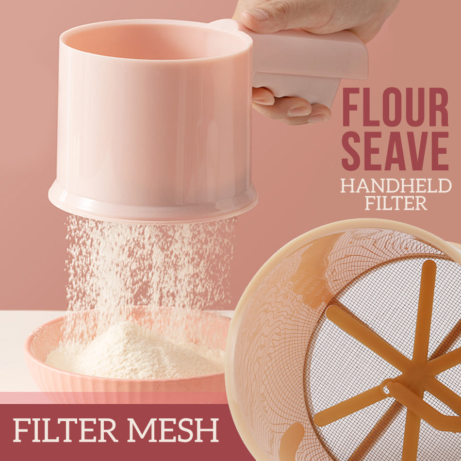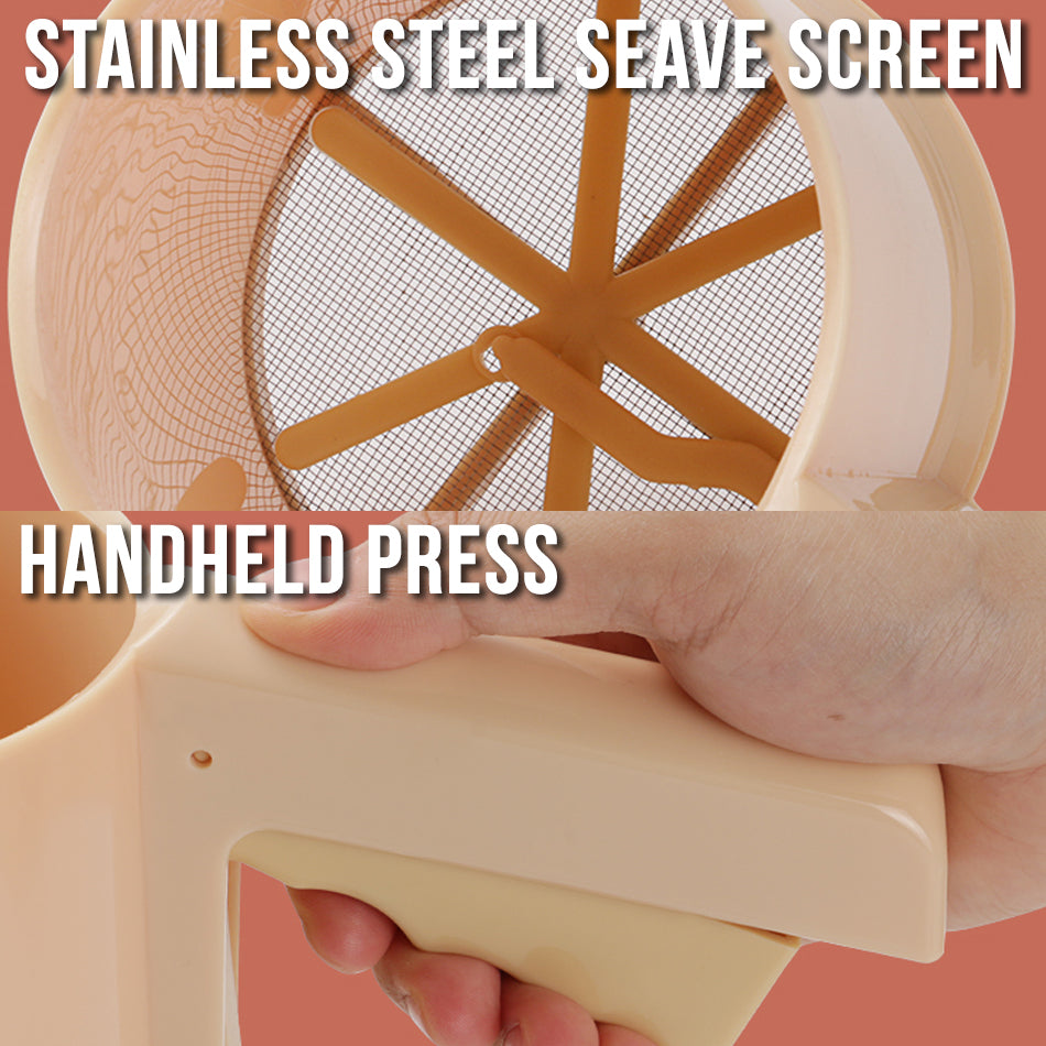A handheld flour powder filter seave. Handheld and handpress feature to filter the flour powder. The filter seave is a stainless steel filter seave screen.