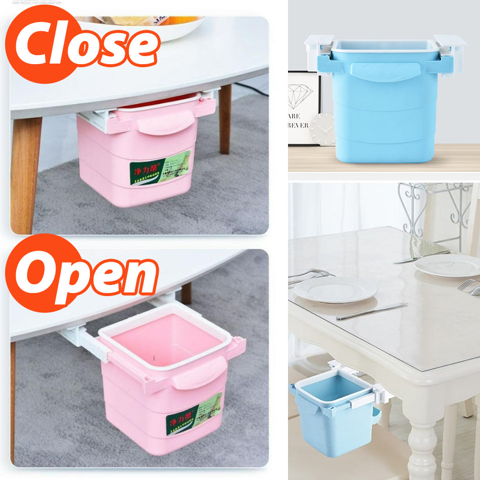 A tabletop mini sliding trash bin drawer. It is mounted below the table and can be used for being a mini trash rubbish bin and also as a mini storage box. Made from ABS and PP material and also many random colors.