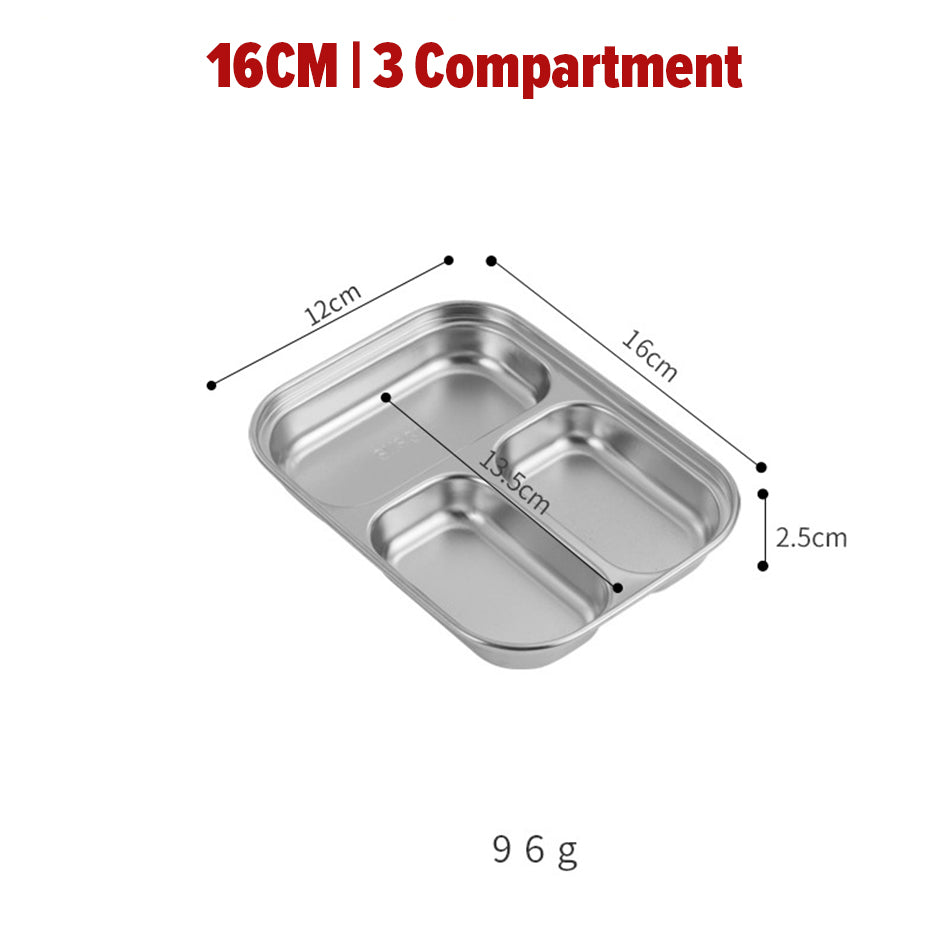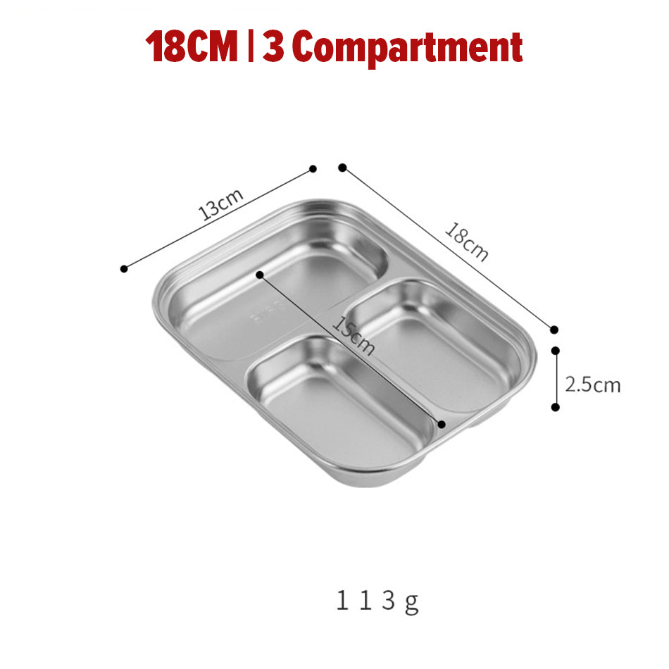 A multicompartment stainless steel dinner plate. Made from stainless steel 304.
