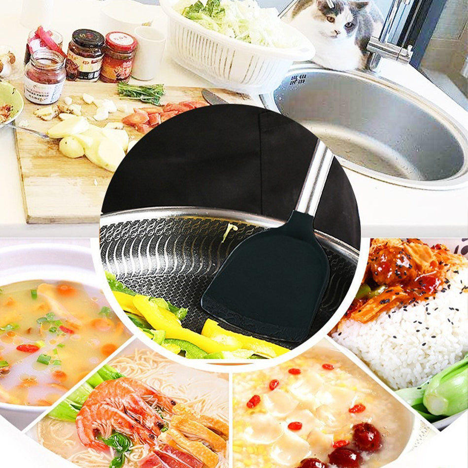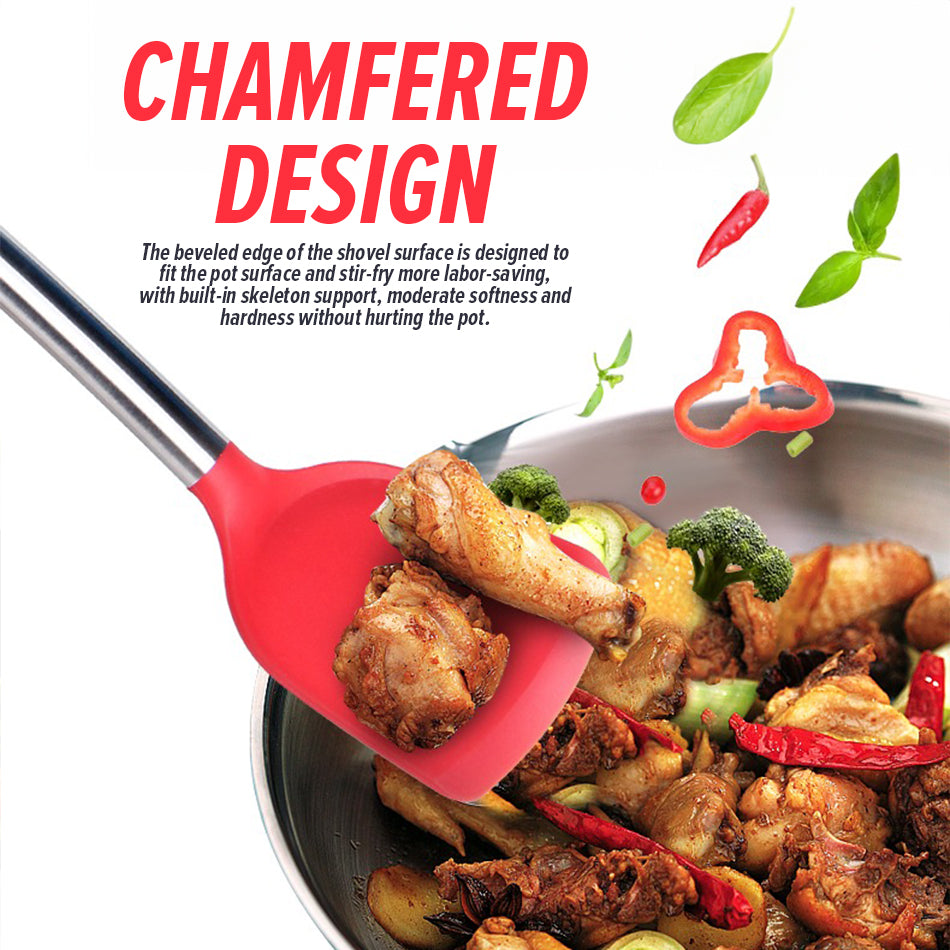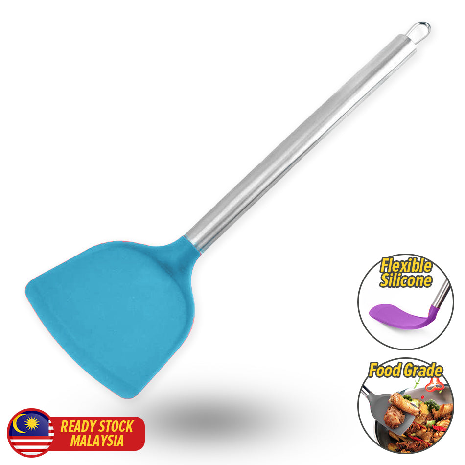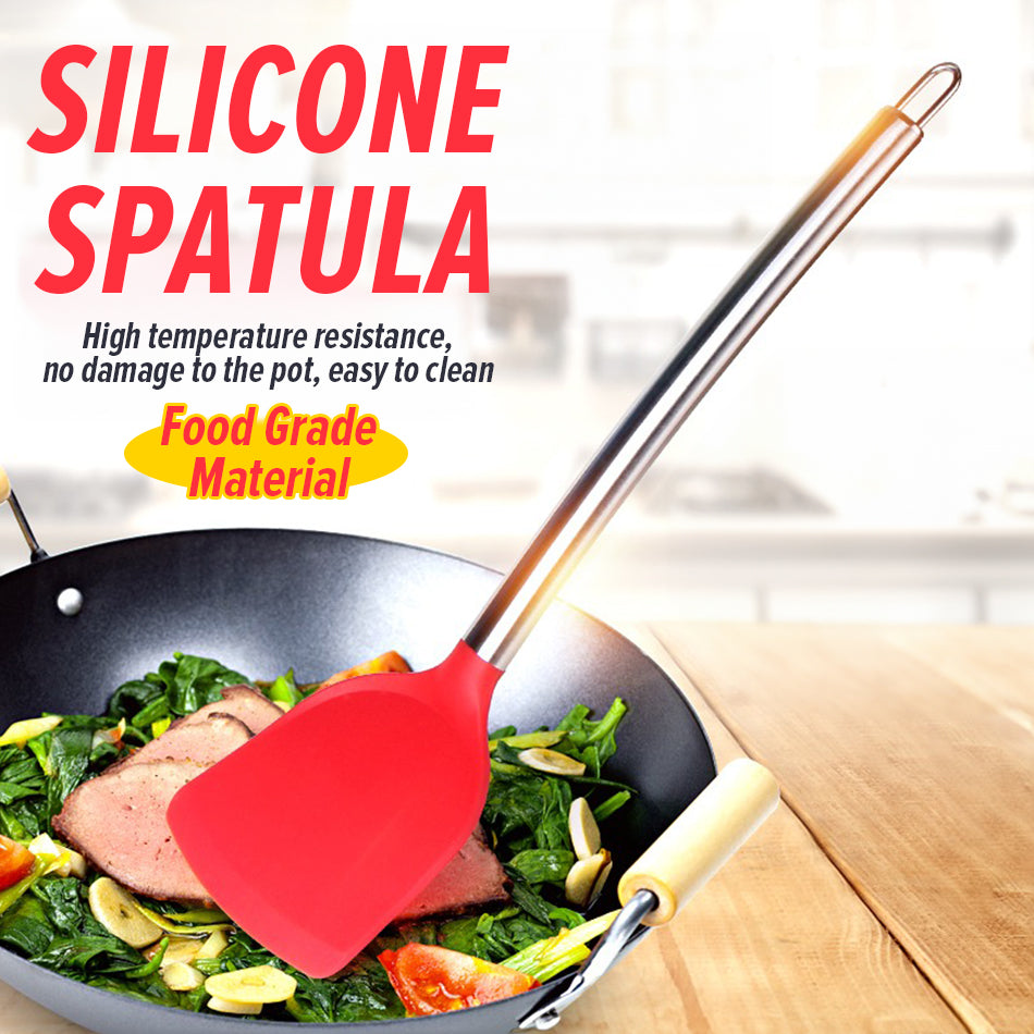 A kitchen silicone cooking spatula with stainless steel handle. Flexible and food grade material.