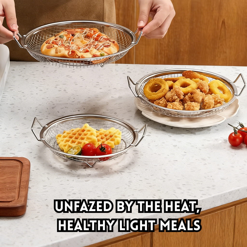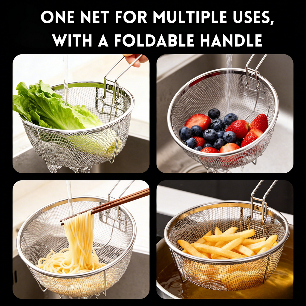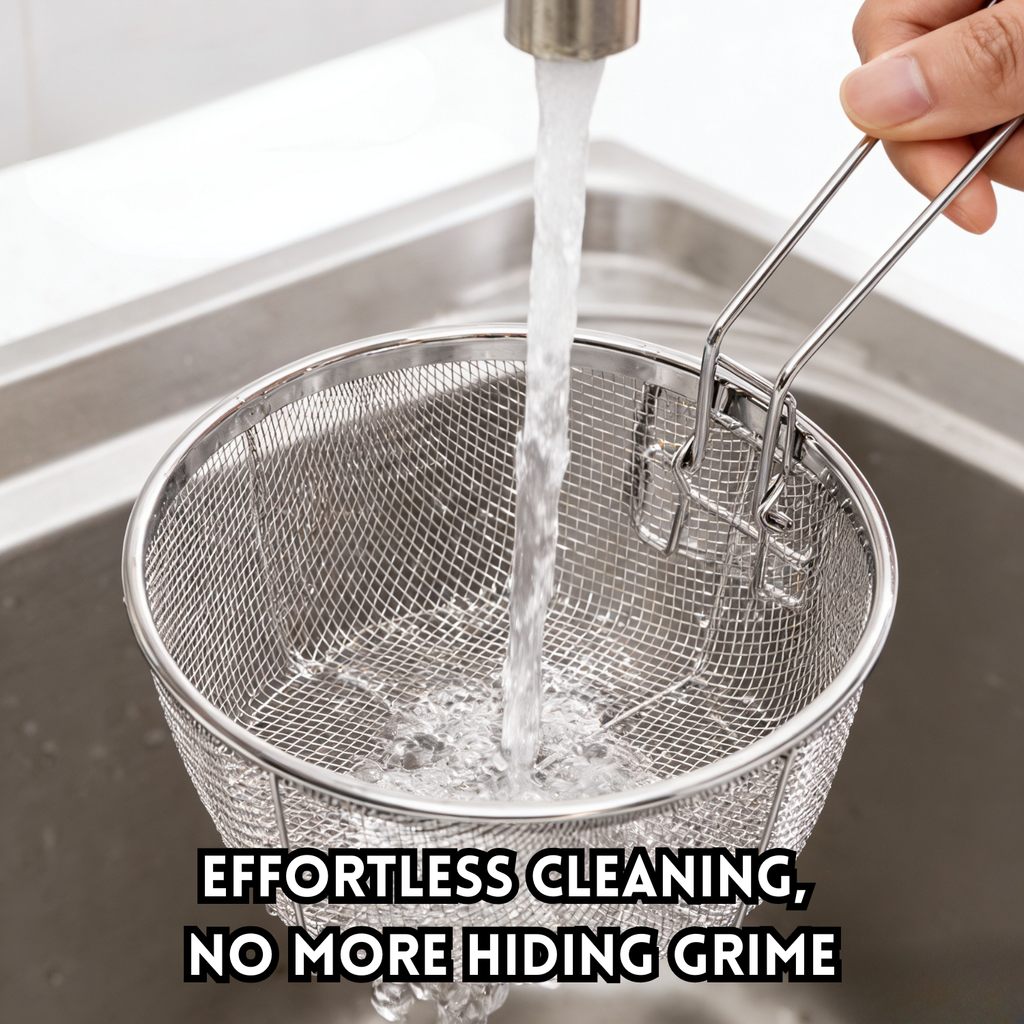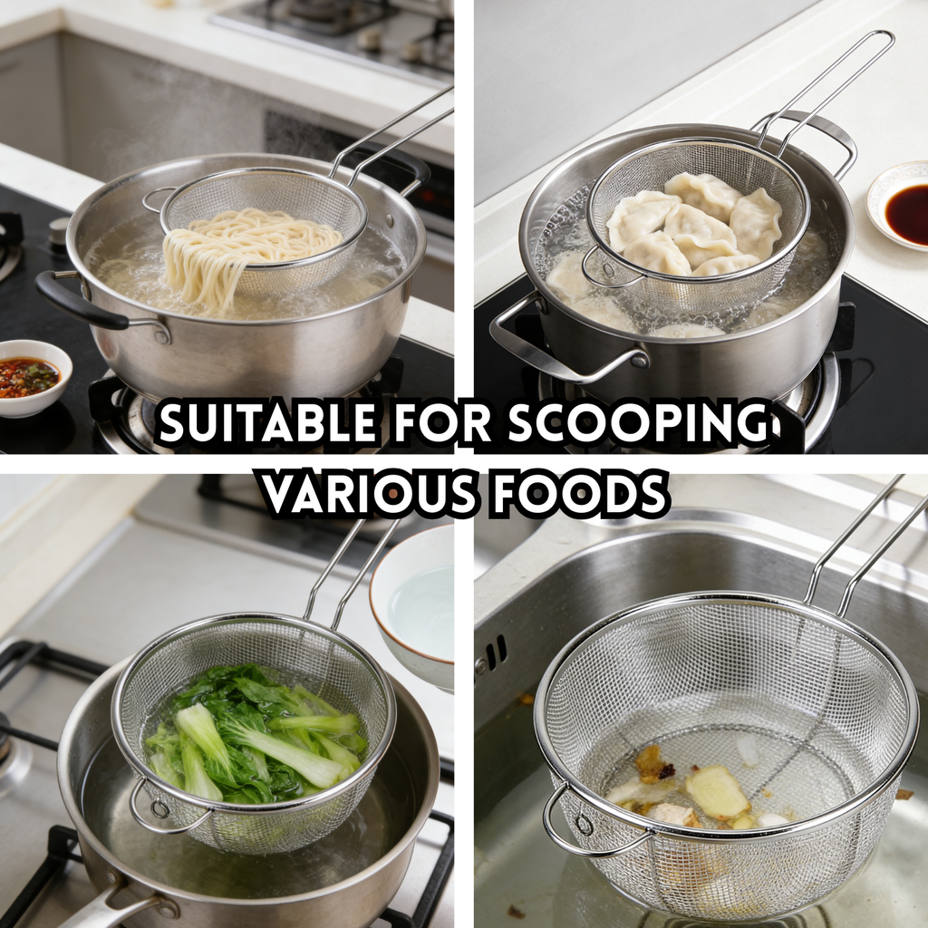 Featuring a fine mesh basket design, this strainer effectively filters excess oil, food residue, and impurities, helping you achieve crispier, less greasy fried food. It also acts as an anti-oil splash barrier, reducing oil splatter during frying and enhancing cooking safety.