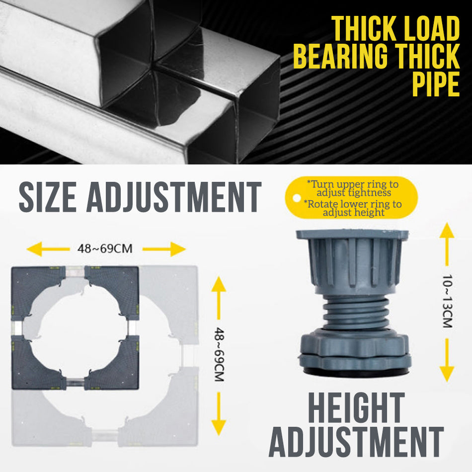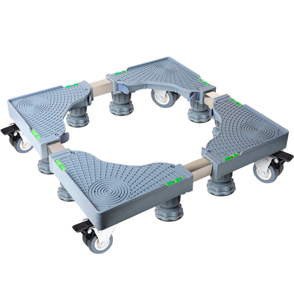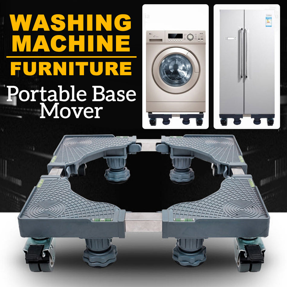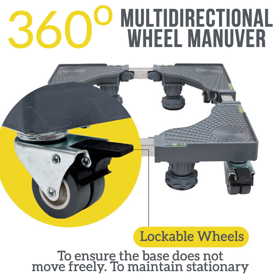 A washing machine/fridge/furniture base mover that is capable of being stationary and mobile with it's 360° rotating wheel. The wheels are capable to be locked to disable movement. The base can be adjusted in size area and even slight height to fit the furniture or electronic furniture to be used. It is made from sturdy stainless steel frame and with plastic parts. It also has a liquid balance scale to notify that the base mover is horizontally straight and stabilized.